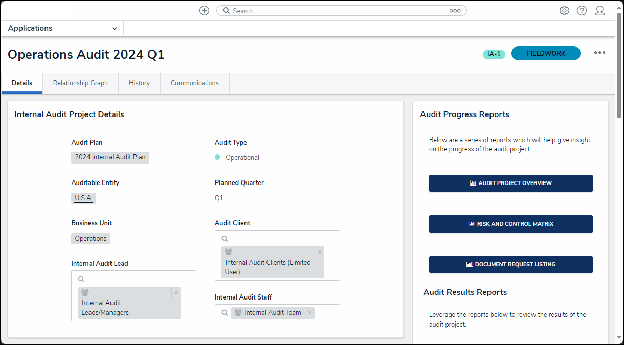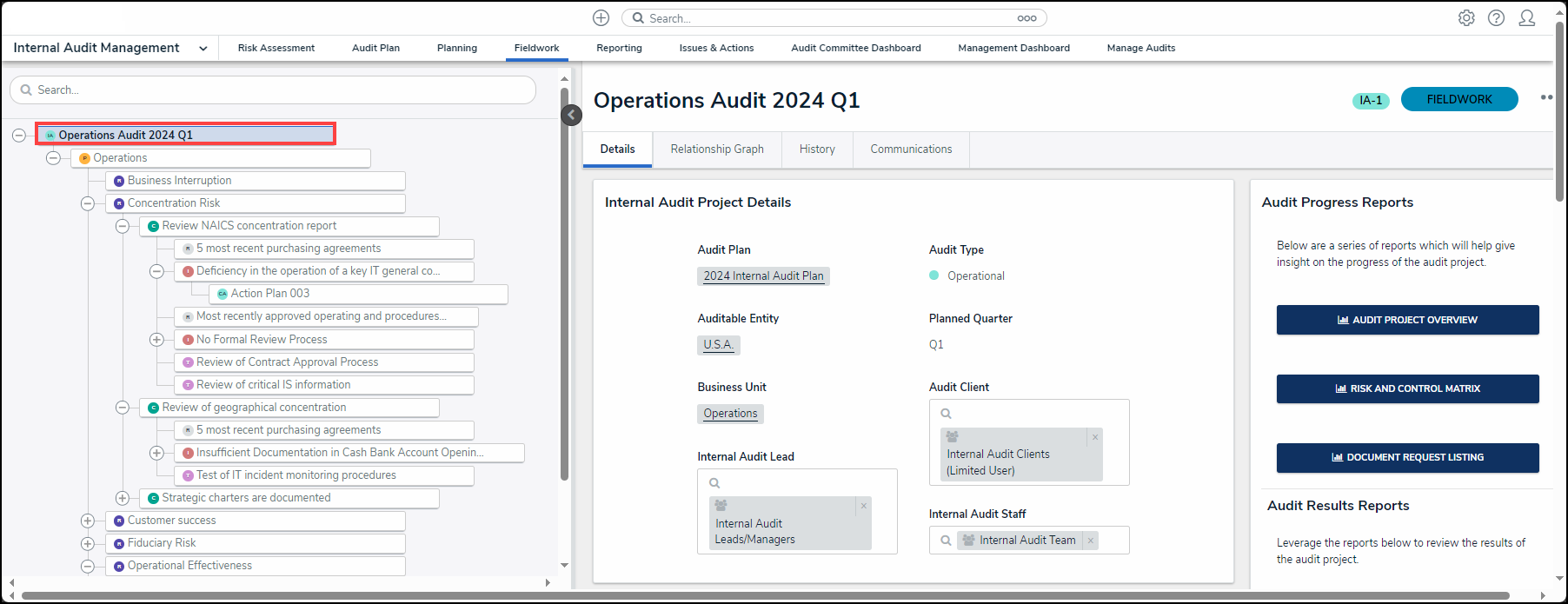 - Click the Internal Audit Project node to open the Internal Audit Project Details tab. The internal audit project is indicated with an IA icon next to the internal audit project name on the node.