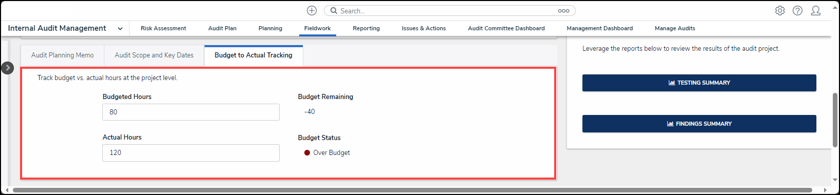 - Actual Hours: Enter the actual number of hours it took to complete the internal audit project.
