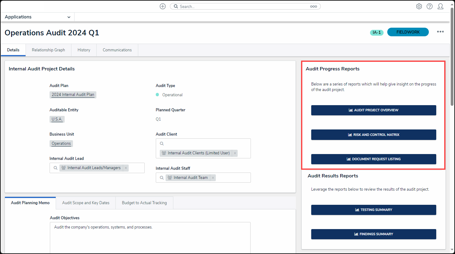 - Risk and Control Matrix: View a summary of processes, risks, controls, and test connected to the internal audit project.