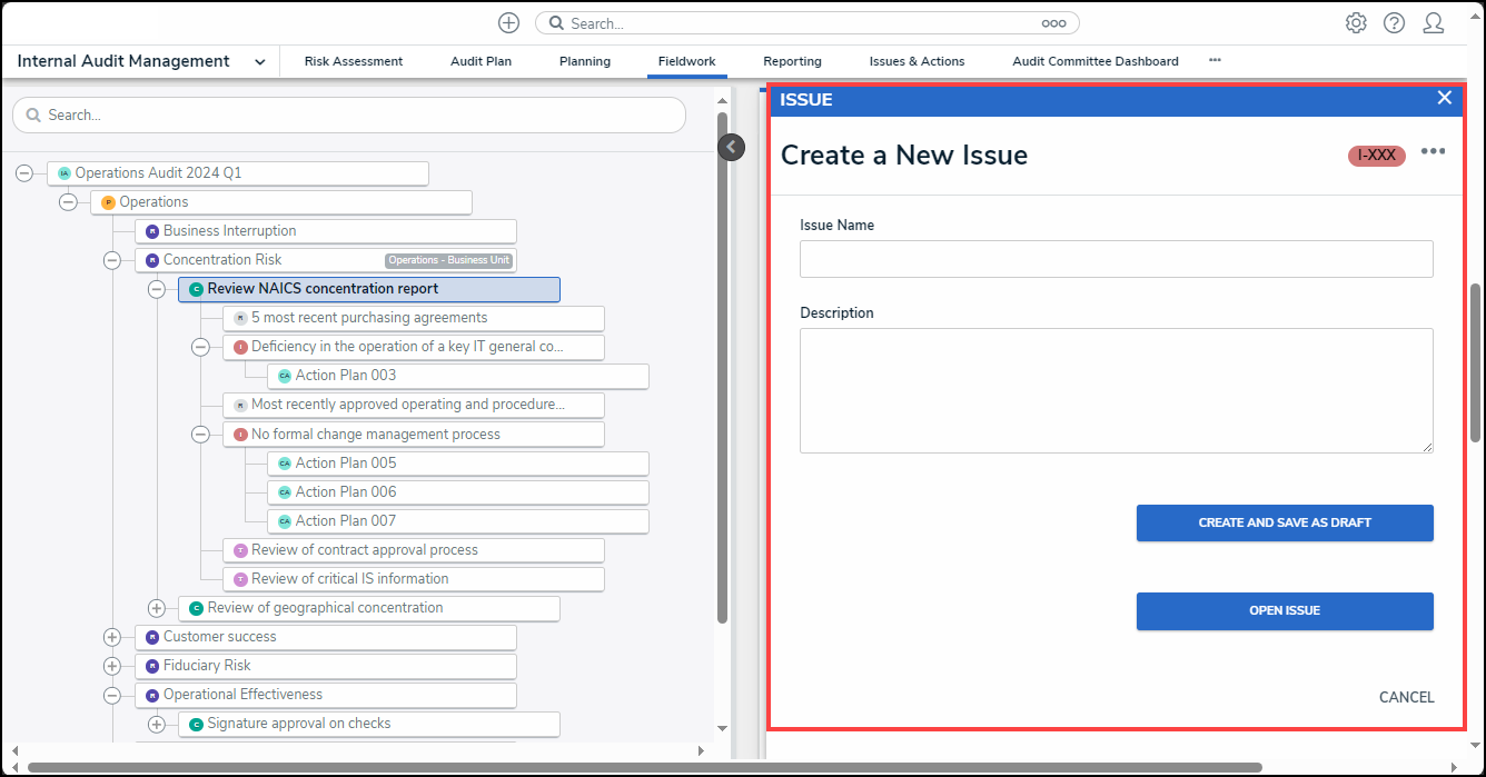 - Create and Save as Draft: The Create and Save as Draft button will move the Issue from the Creation state to a Draft state and save changes made to the form so that you can come back and finish filling out the form at a later date before moving the Issue to an Open state.