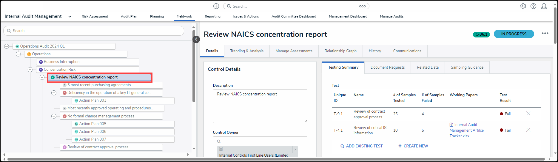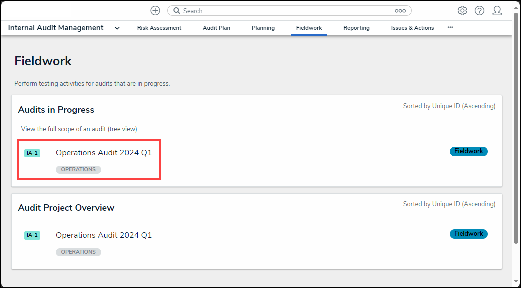 - From the Fieldwork screen, click the Internal Audit Project that contains the control you want to review from under the Audits in Process section.