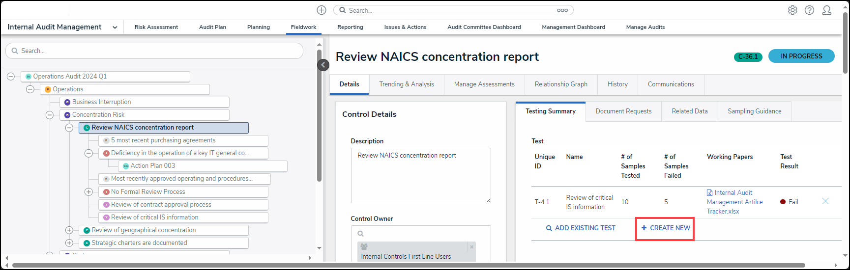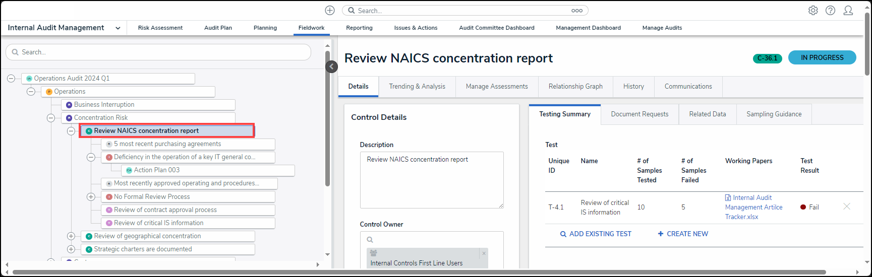- From the Fieldwork screen, click on the Internal Audit report name that contains the control you want to perform from the Audits in Progress section.