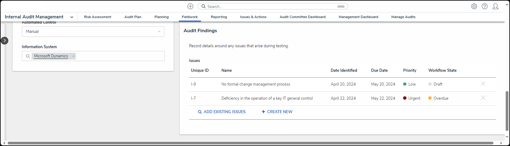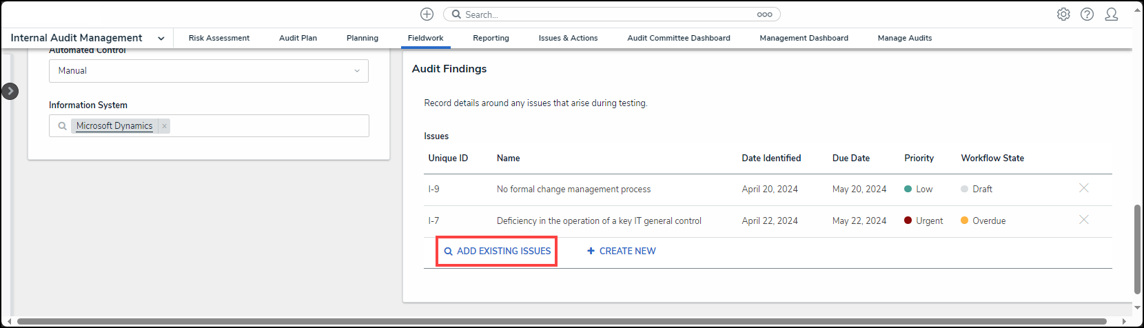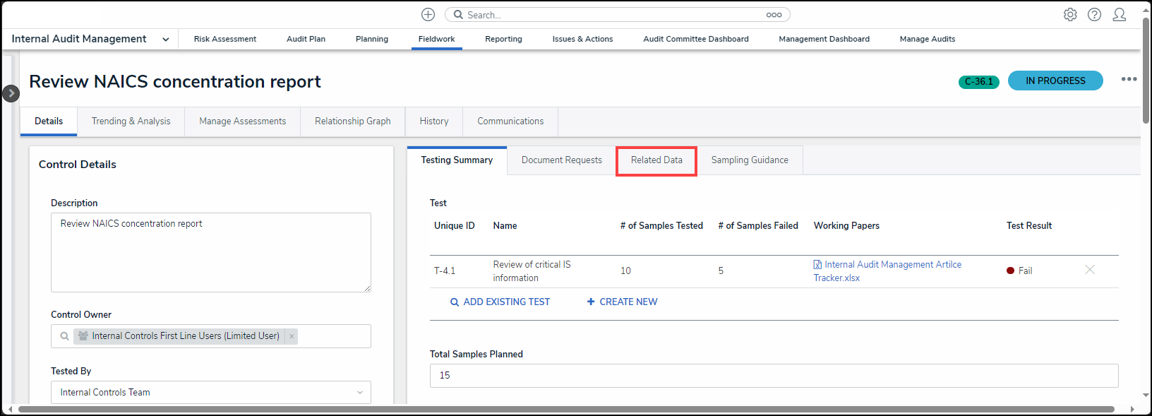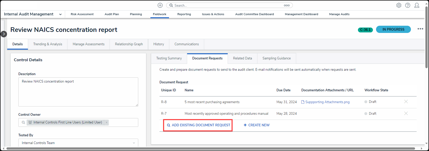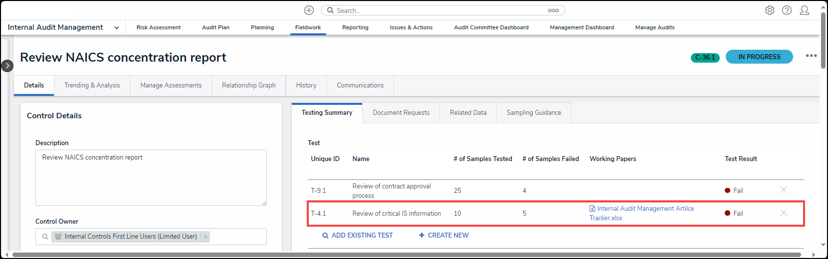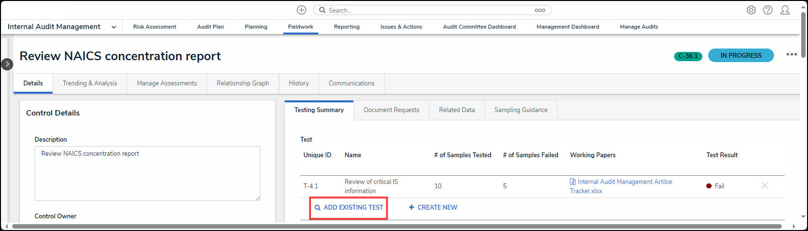 - From the Fieldwork screen, click on the Internal Audit report name that contains the Control Test you want to perform from the Audits in Progress section.