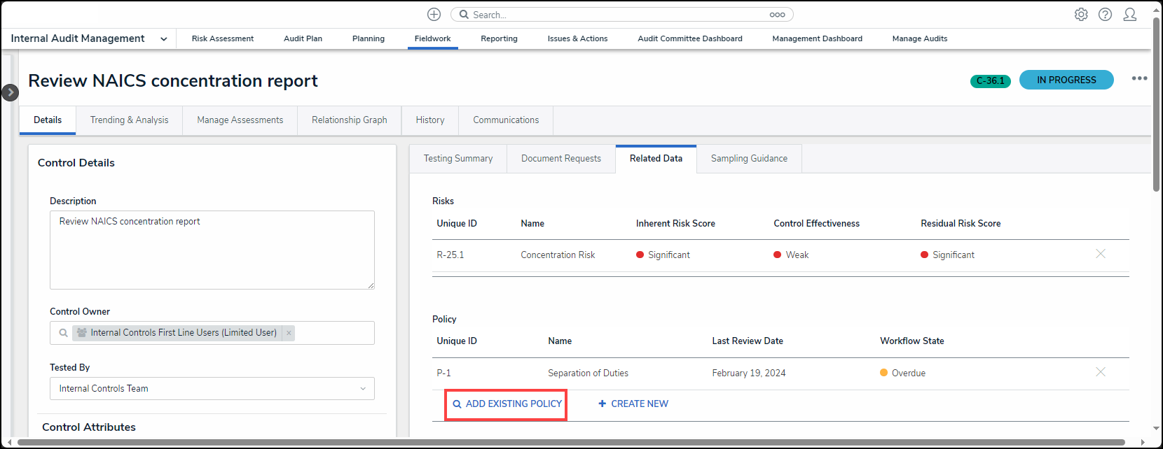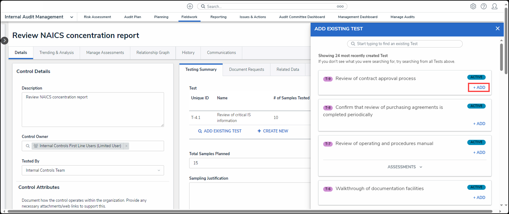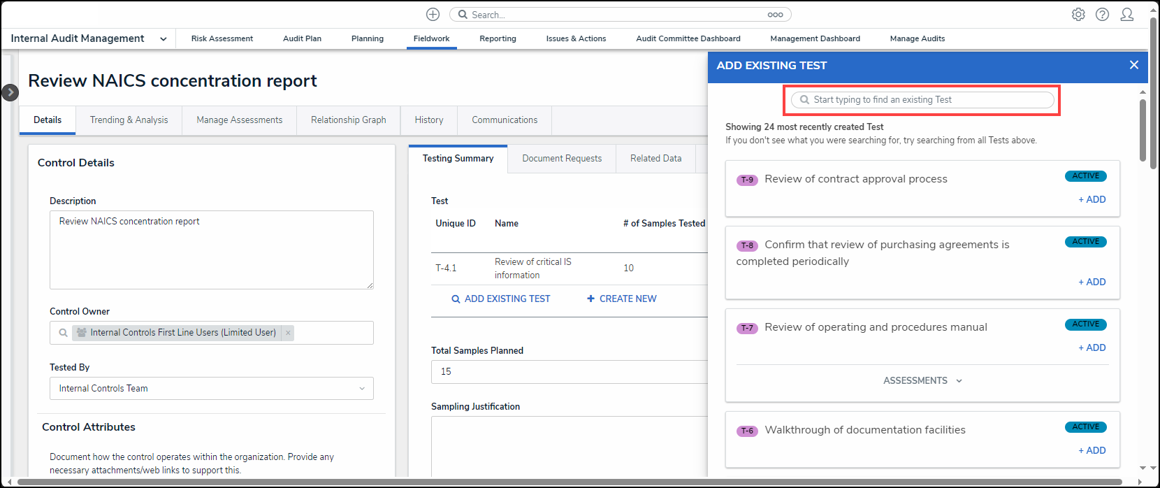 Adding an Existing Test, Document Request, Policy, Corrective Action, or Issue to a Control