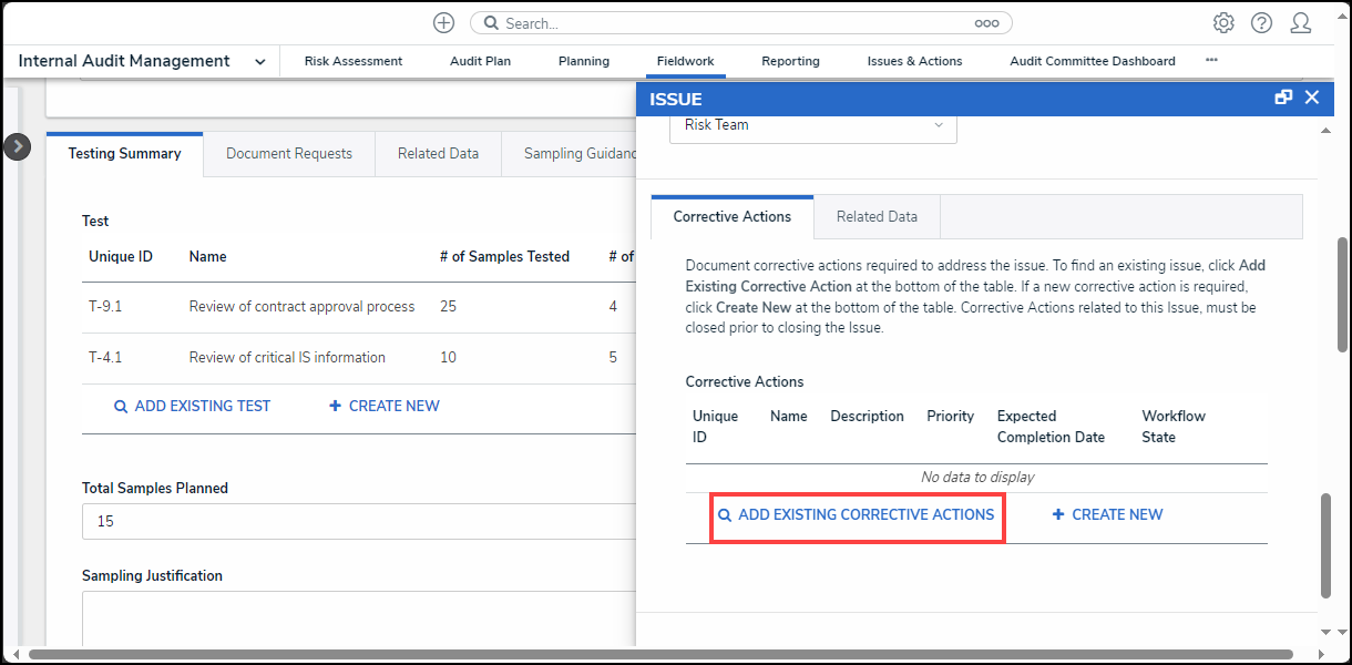 - From the Issue pop-up, scroll to the Corrective Actions tab and click the Add Existing Corrective Actions link.