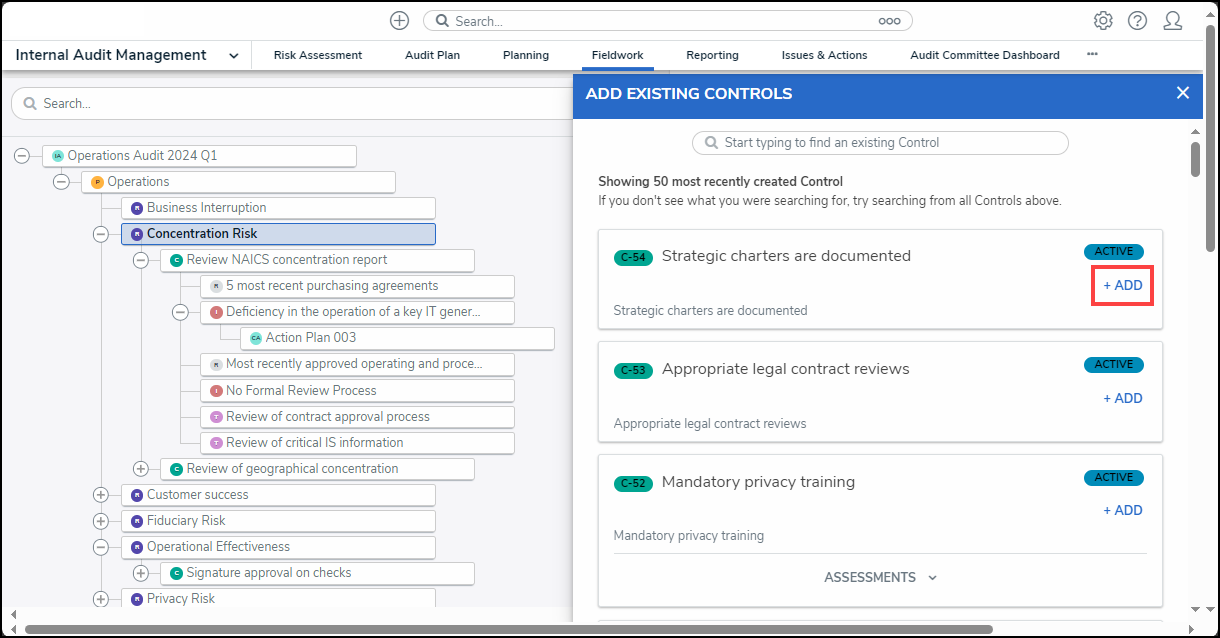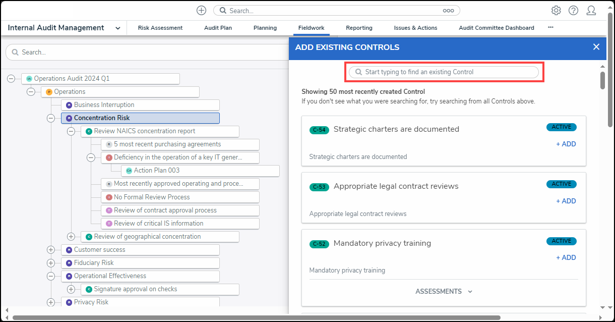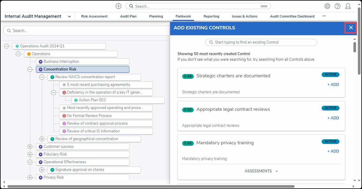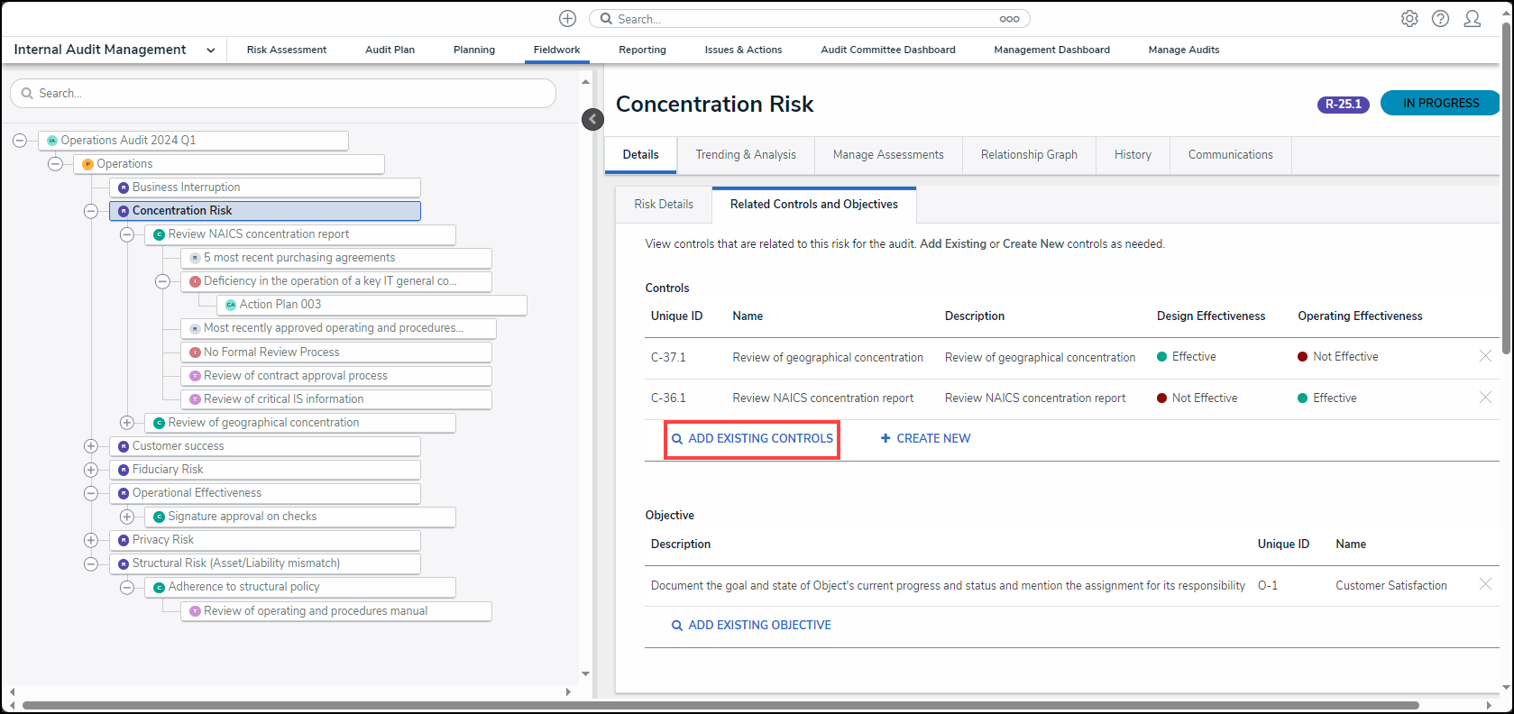 The process for adding an existing control or objective to a risk is the same. The only difference is the navigation. For this illustration we will be adding a control to a risk.