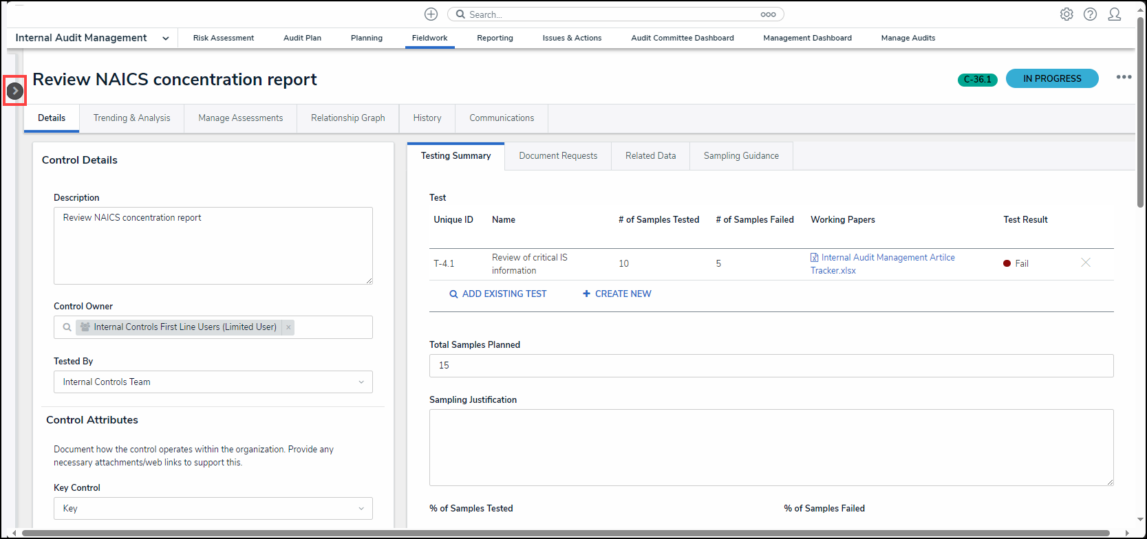 - From the Fieldwork screen, click on the Internal Audit report name that contains the Control Test you want to perform from the Audits in Progress section.