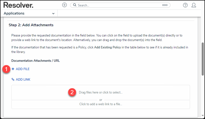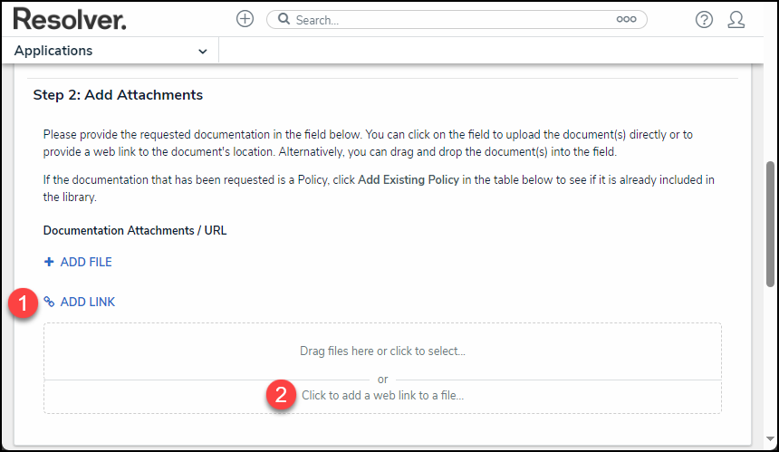 - Add any requested documentation to the Document Attachments/URL field under the Step 2: Add Attachments section by dragging and dropping a file in the Document Attachments/URL field or by clicking the Add File link and selecting a file from the connected PC.