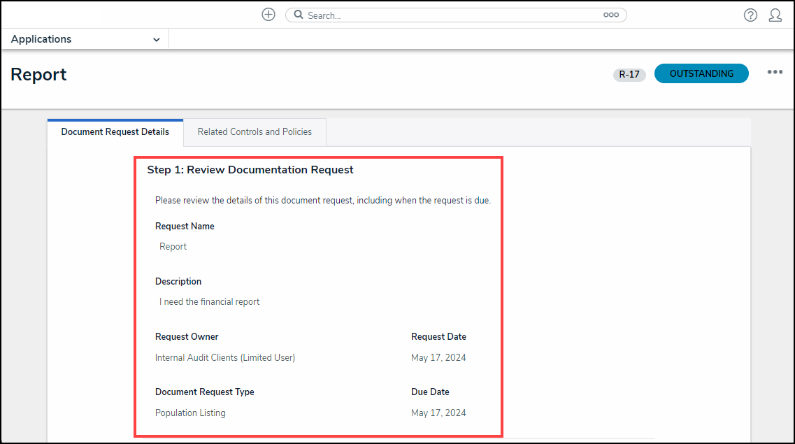- From the Document Request Details tab, review the document request information in the Step 1: Review Documentation Request section. Note the Due Date field, as this will indicate when the Document Request is due.