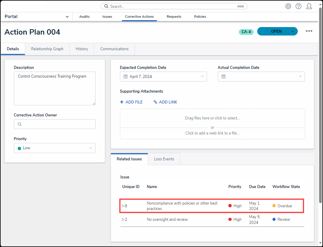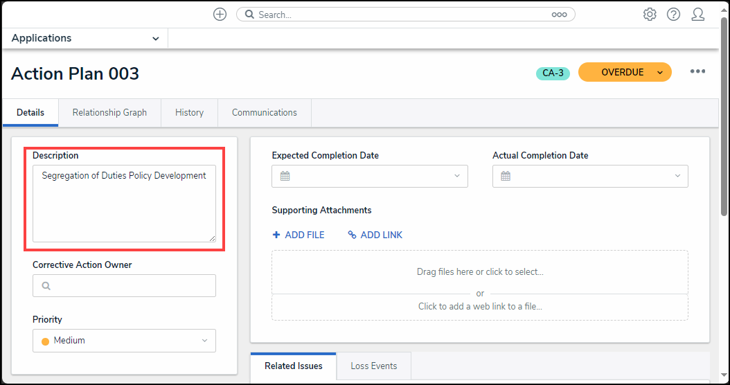 - Set a corrective action priority by clicking the Priority field and selecting a priority from the dropdown menu.