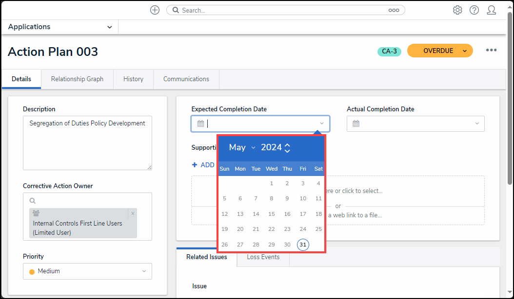- (Optional) Select the date the corrective action is expected to be completed by clicking the Expected Completion Date field and selecting a Date from the Calendar pop-up.