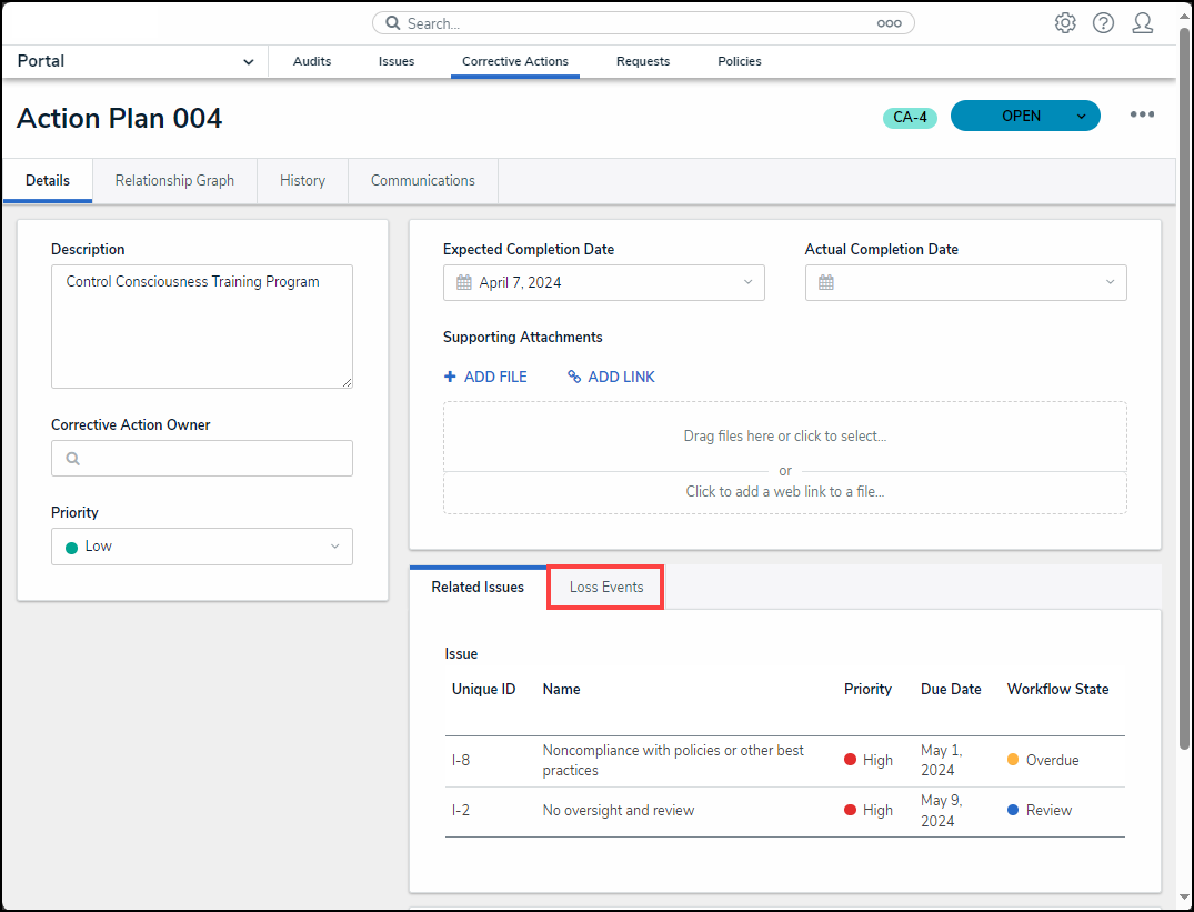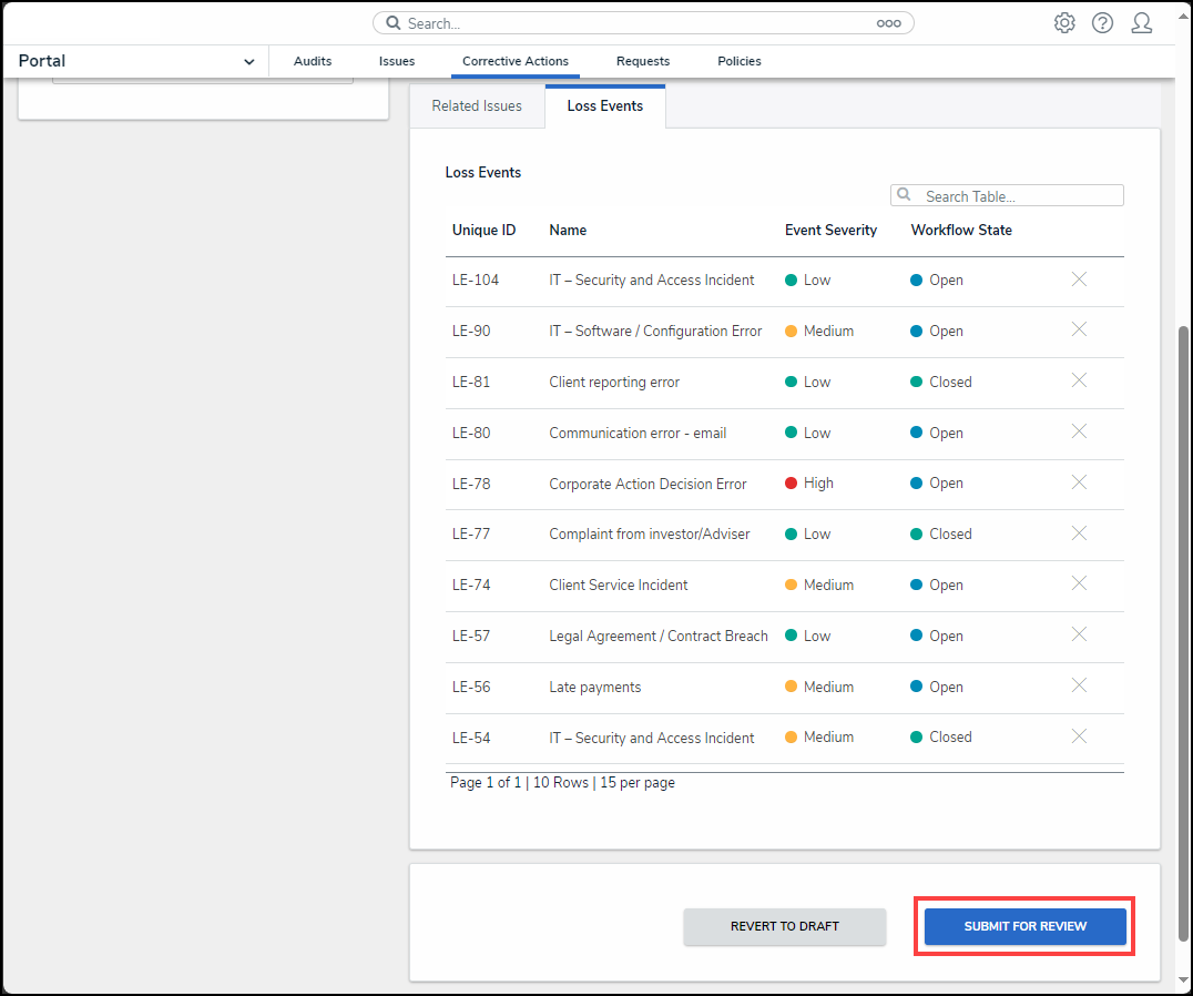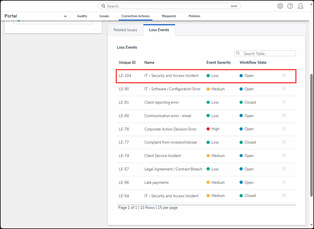 - From the Loss Events tab, click on a loss event on the Loss Events table to view the loss event.