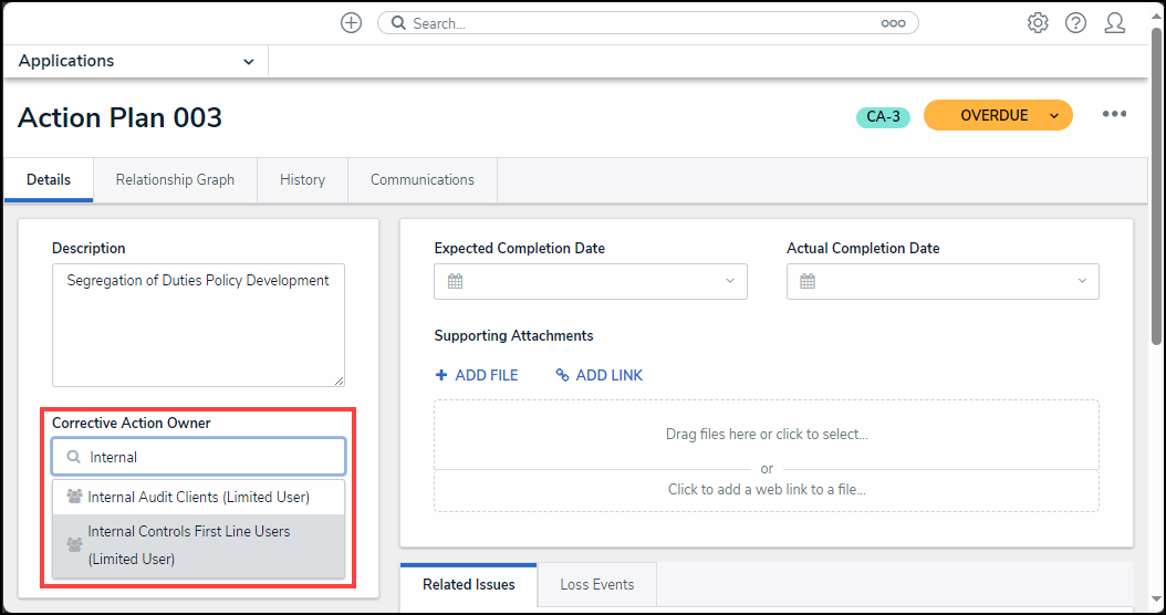 - Enter a user or user group name in the Corrective Action Owner field and select a user or user group from the dropdown menu.