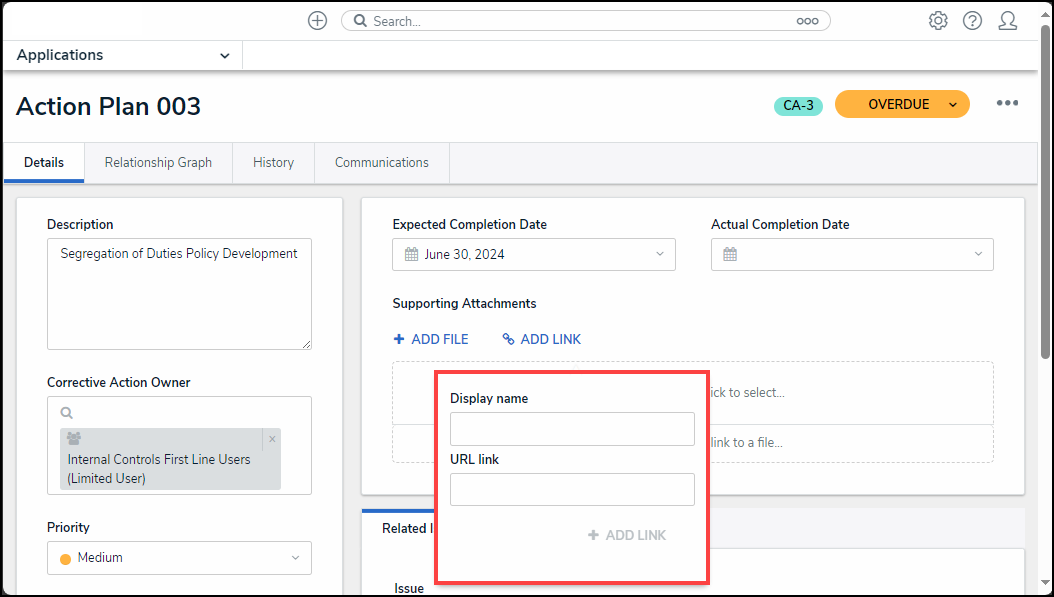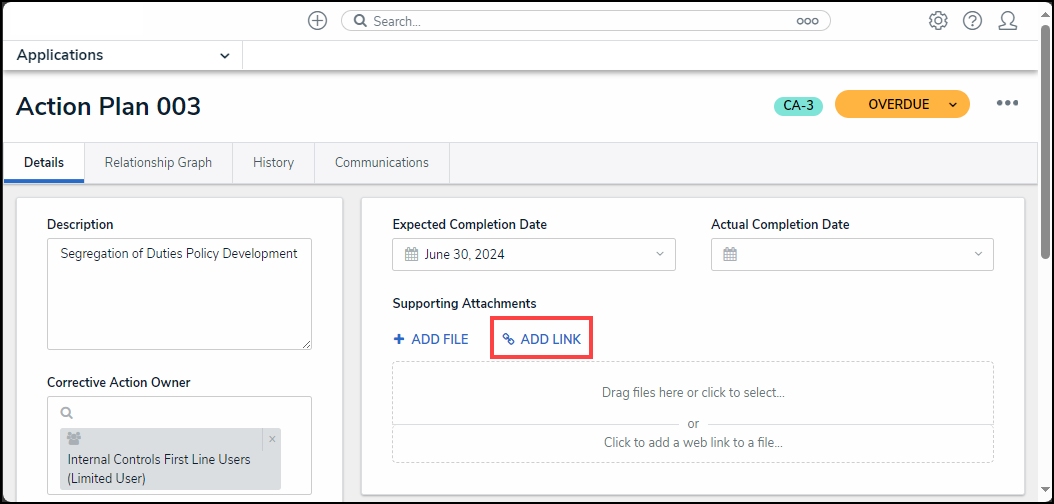 - Users can attach evidence to the corrective action by clicking on the Add Link link to attach a web link to the corrective action or click the Click to add a web link to a file link.