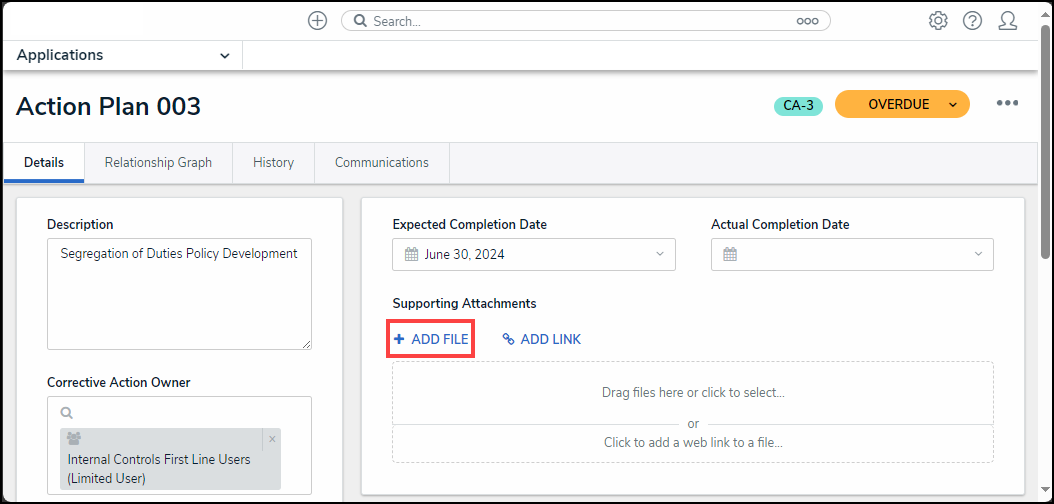 - Users can attach evidence to the corrective action by dragging and dropping an image in the Supporting Attachments field or clicking the + Add File link and selecting an image from the connected PC. The maximum size for Files is 100 MB. the following file types are not valid (.bat, .exe, .gif, .sh, .dll, or .com).