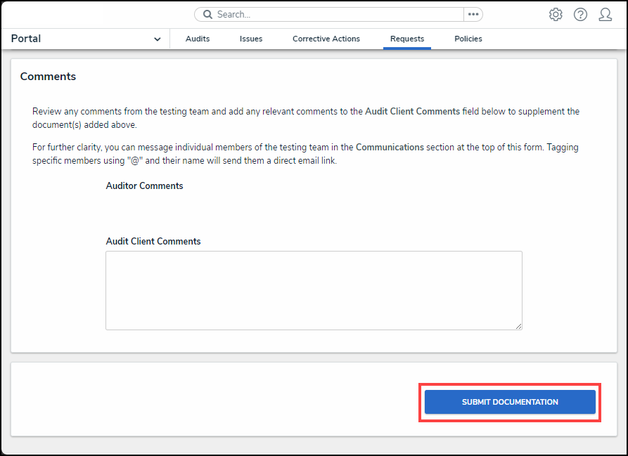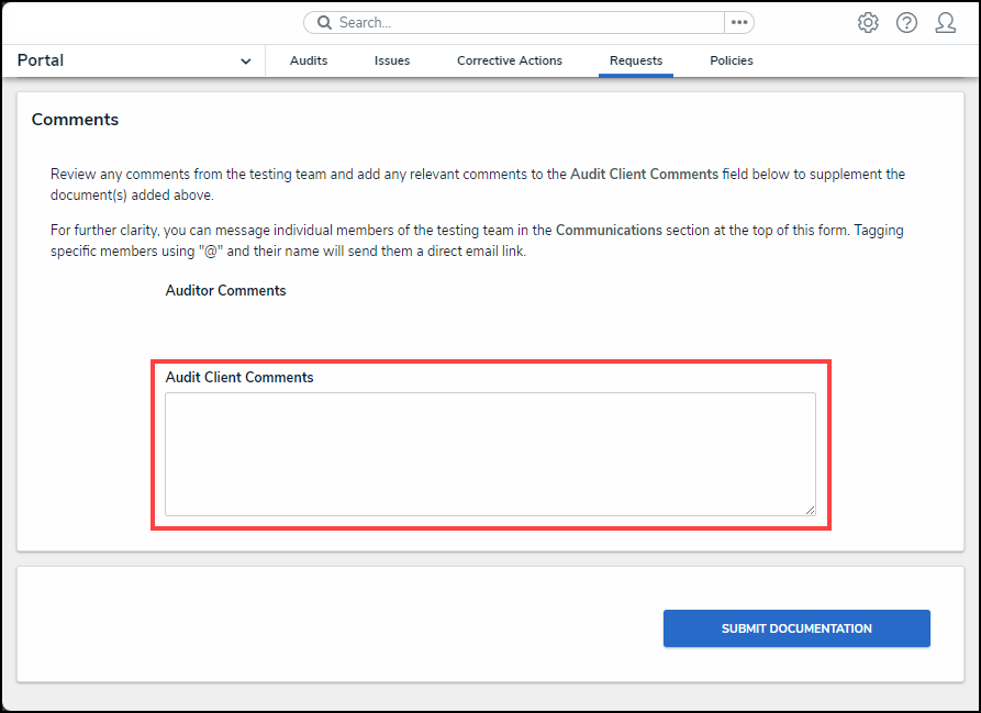 - From the Comments section, add any additional comments regarding the document request or supporting documentation in the Audit Client Comments field.