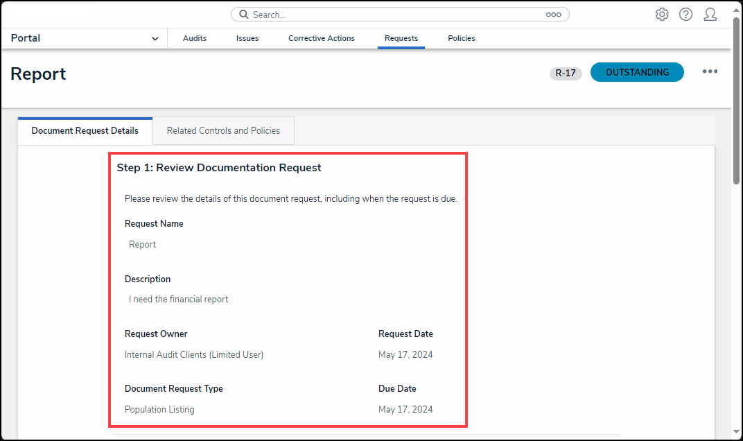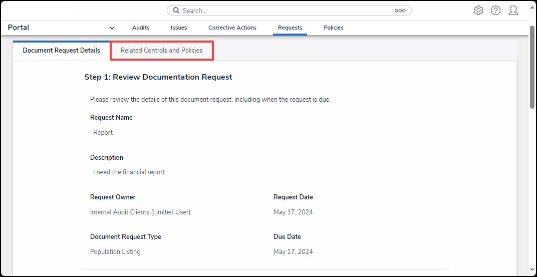 Users can request specific documents for their audits from an Audit Client. Audit Clients can be another user in the organization that we are auditing one of their process or controls.