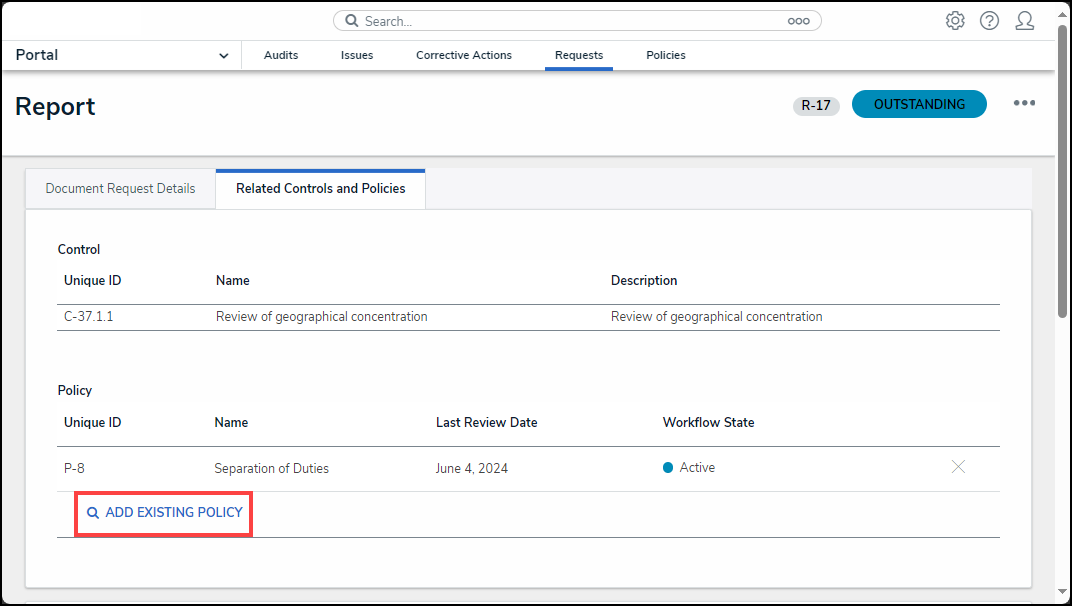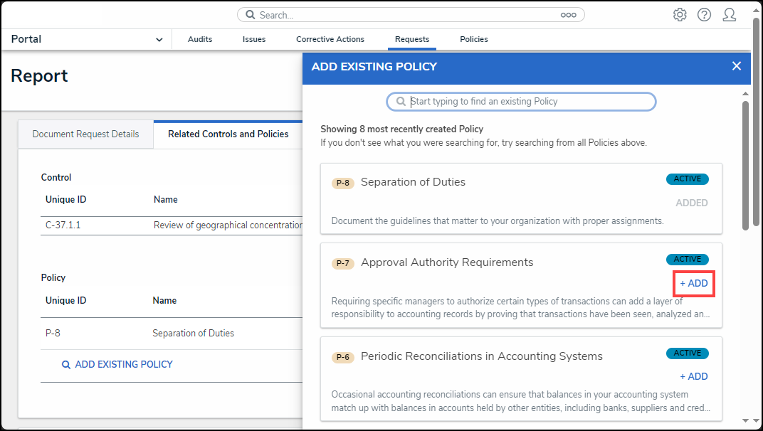 - From the Add Existing Policy pop-up, select the Add link next to a policy to add an existing policy to the documentation request.