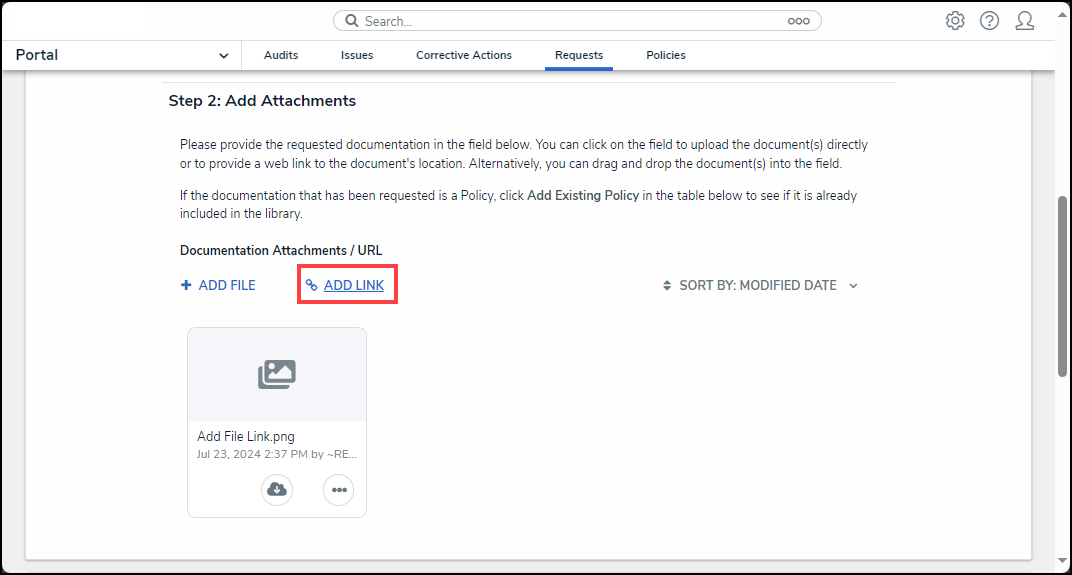 - Users can attach evidence to the issue by clicking on the Add Link link to attach a web link to the issue or click the Click to add a web link to a file link.