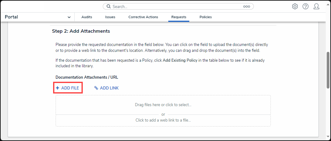 - From Step 2: Add Attachments section Users can attach evidence to the issue by dragging and dropping an image in the Supporting Attachments field or clicking the + Add File link and selecting an image from the connected PC. The maximum size for Files is 100 MB. the following file types are not valid (.bat, .exe, .gif, .sh, .dll, or .com).