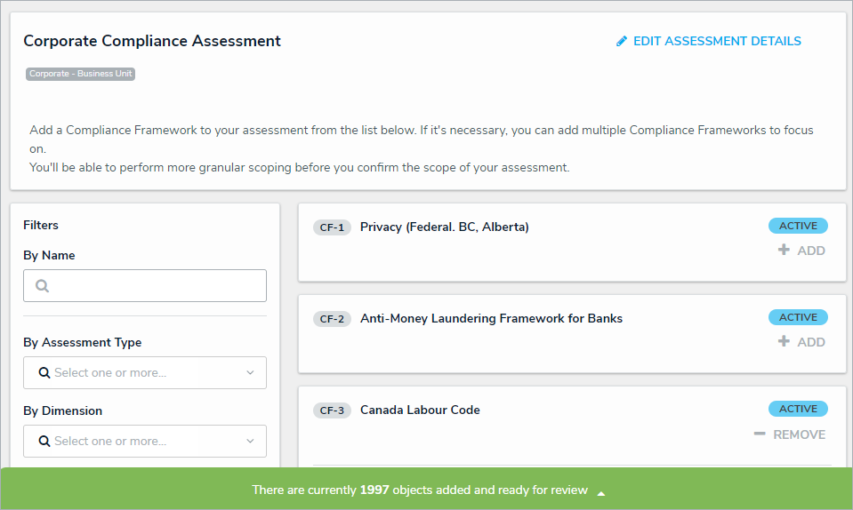 - Select one or more compliance frameworks as the focus of your assessment by clicking + Add.