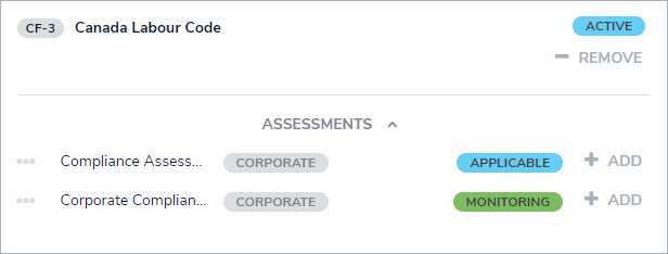 - To add an instance to the assessment, click the Assessments link below an object, then click Add. For more information about an instance, hover your cursor over the ellipsis beside the record.