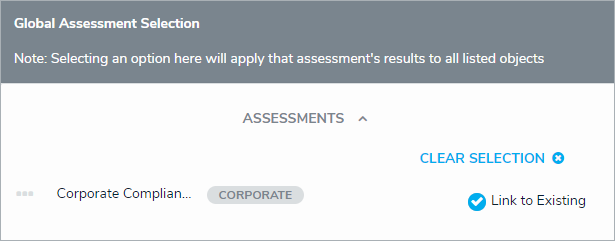 - Optional: To link to all the applicable objects of a particular assessment, click Assessments on the Global Assessments Selection section, then check Link to Existing next to the assessment you wish to use objects from.