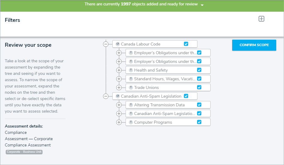 Users in the Compliance Team user group must scope an assessment to define which compliance frameworks, topics, sub-topics, or requirements should be assessed (e.g., topics from the Anti-Money Laundering Framework). Assessments can be scoped at the time of assessment creation or from the Determine Applicability activity.