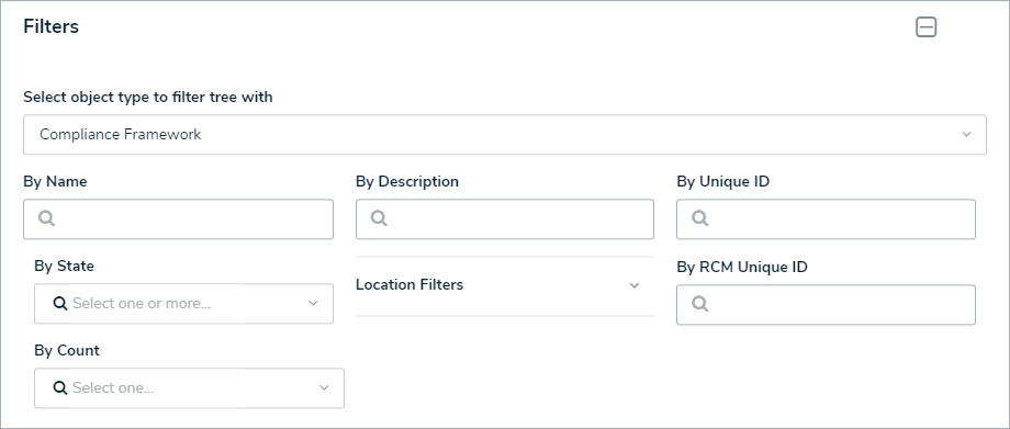 - For example, in the screenshot below, selecting Compliance Assessment in the By Assessment Type: Filters to only display frameworks on which an assessment was previously completed through the Compliance Assessment type.