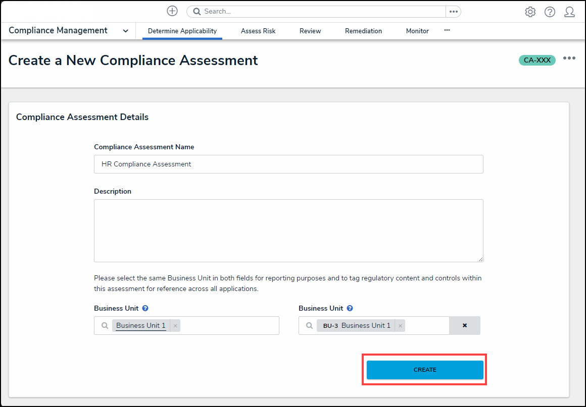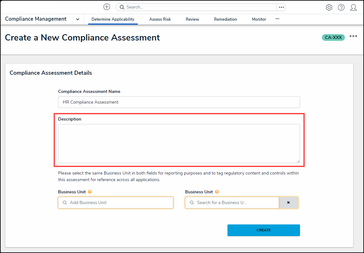 - (Optional) Enter a brief description outlining the compliance assessment in the Description field.