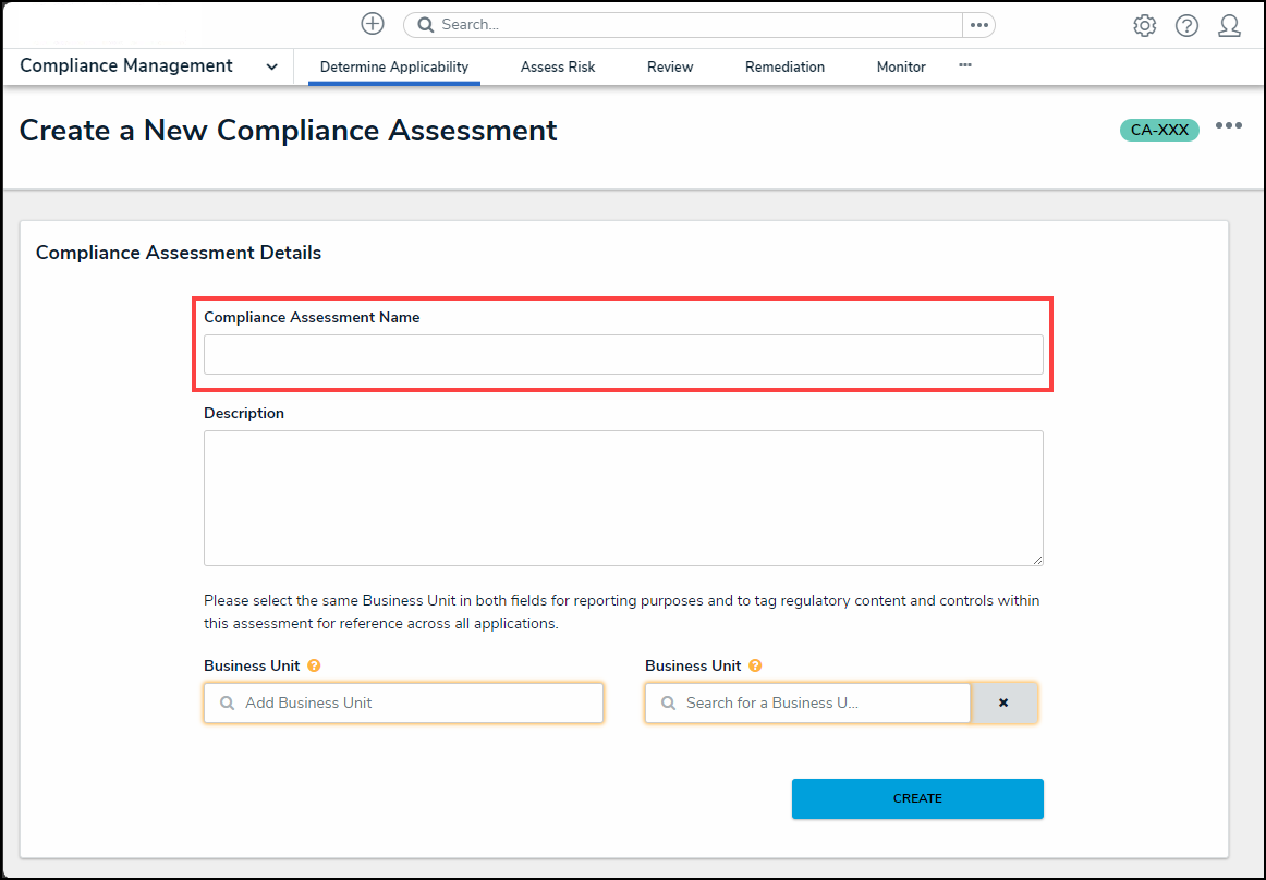 - From the Create a New Compliance Assessment screen, enter an assessment name in the Compliance Assessment Name field. The Compliance Assessment Name is used to identify the assessment throughout the system and for historical purposes.