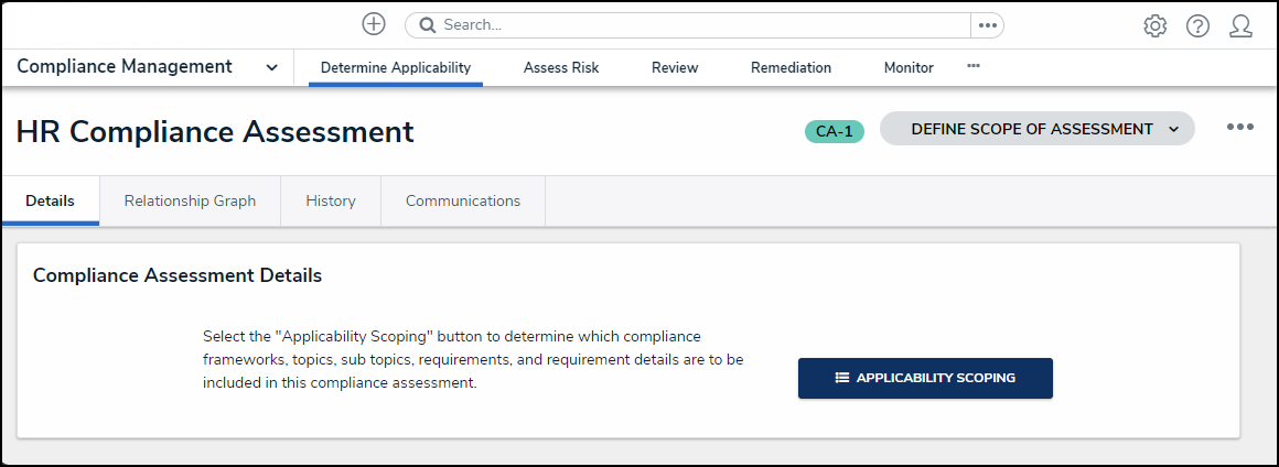 - The Compliance Assessment Details tab will appear. Now that the Compliance Assessment is launch the next step is to scope the assessment. Please refer to the Scope an Assessment in Compliance Management article for further information on scoping a Compliance Assessment.