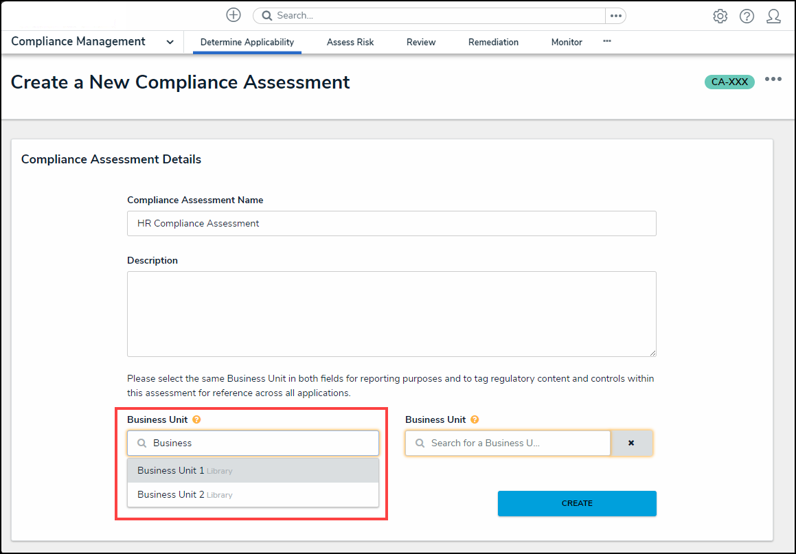 - Enter a keyword in the Business Unit field and click on a Business Unit to add it to the assessment.
