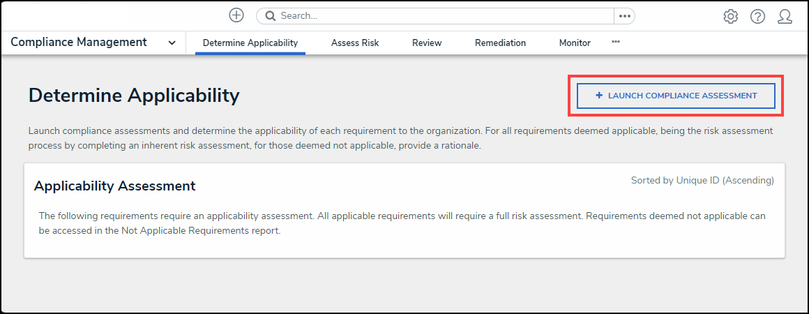 - From the Determine Applicability screen, click the + Launch Compliance Assessment button.