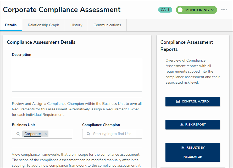 Click an assessment in the Monitoring state to open the Compliance Assessment form.