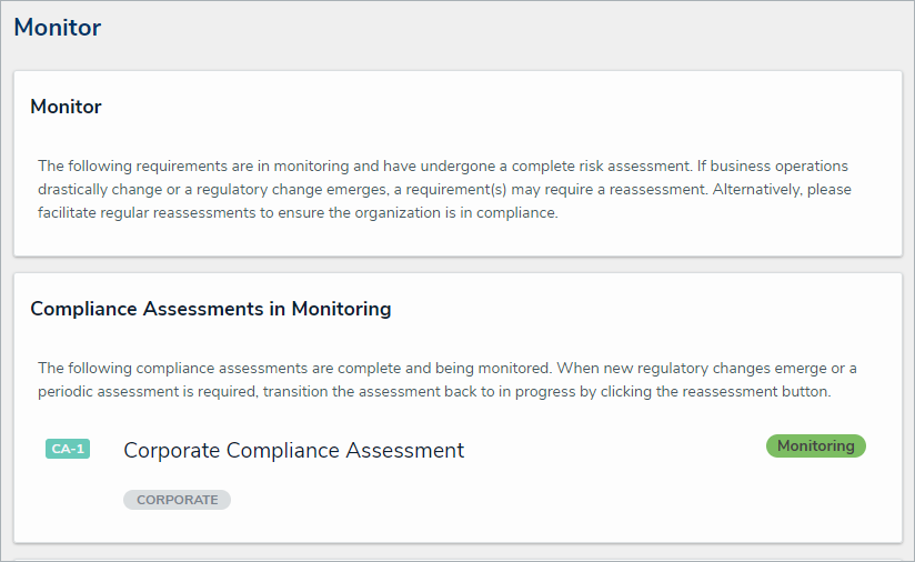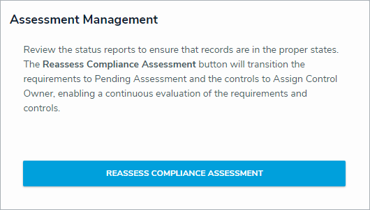 Click Reassess Compliance Assessment to return to the In Progress state, requirements in the Monitoring state will return to the Pending Assessment state, and controls in the Complete state will return to the Assessment state.