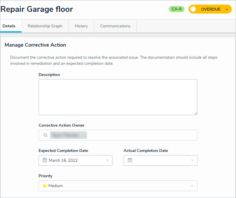 - Optional: Click the header bar to edit the Corrective Action Name (e.g., Repair Garage Floor).