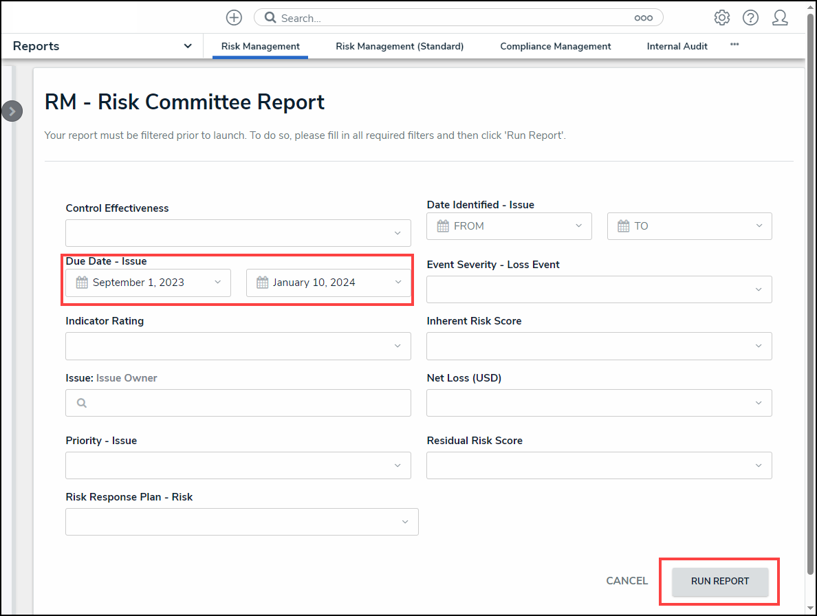 Note: The Run Report button will remain greyed out until all required fields are filled out. |