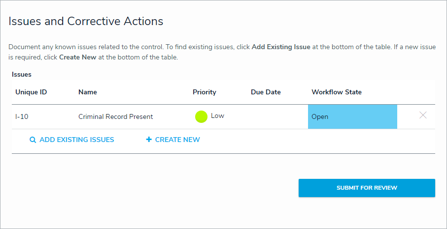 Optional: In the Issues and Corrective Actions section, click Add Existing Issues. Begin typing keywords in the search bar and click + Add next to the desired issue.