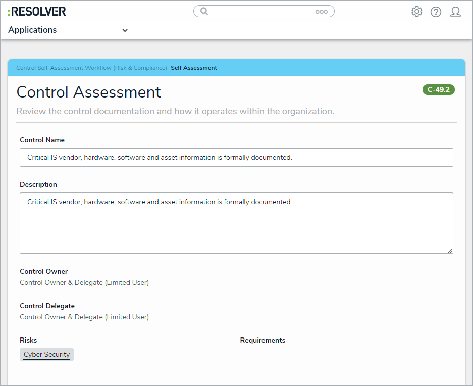 Control owners and their delegates are responsible for reviewing controls to ensure the control documentation meets their organization's needs. Controls are assigned to a requirement, which is then assigned to the Control Owner. All controls that require action from the Control Owner appear on the My Tasks page. A control assigned to the Control Owner on the My Tasks page.