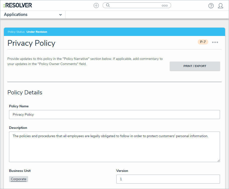 - Click a policy in the Under Revision or Overdue workflow state to open the Policy Overview form.