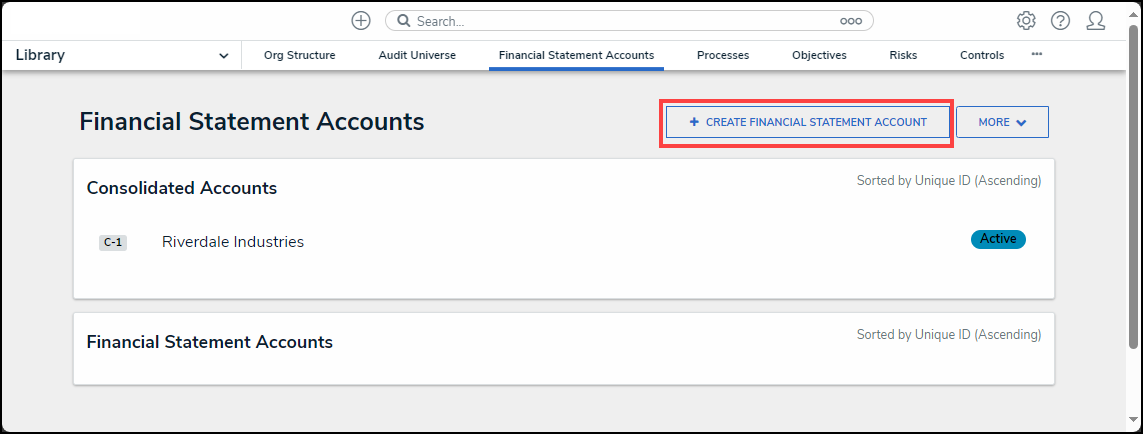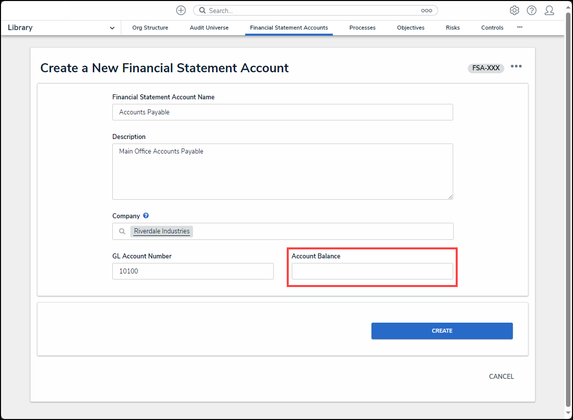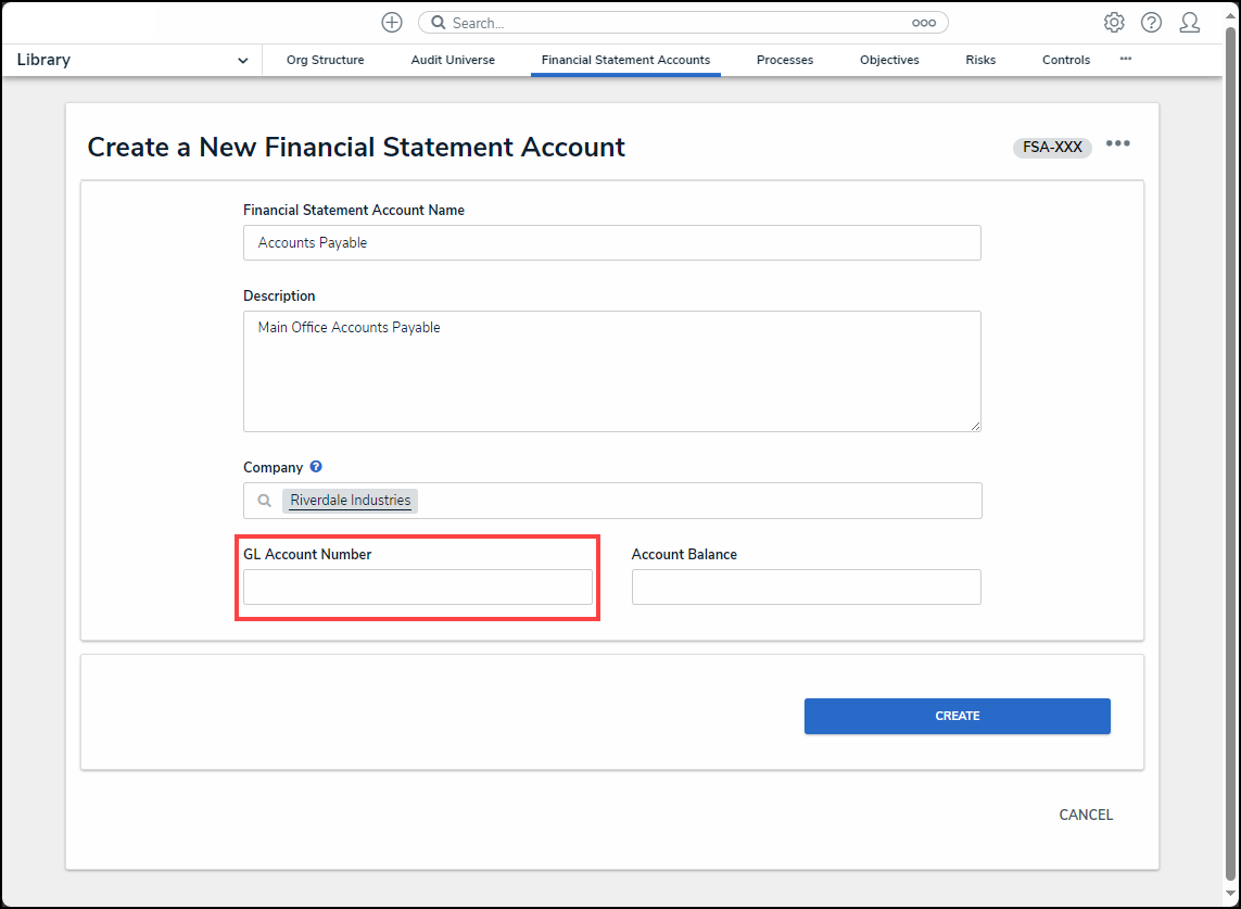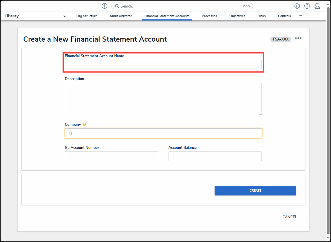 Users can create a Financial Statement Account record within the system through the Library section, in order to manually add new financial statement accounts to the system for use within the Internal Controls Management application. User can also add multiple financial statement accounts by using either the data import feature or integration feature.