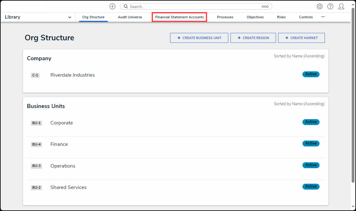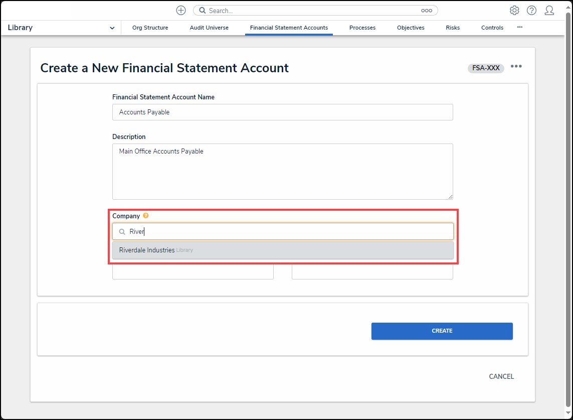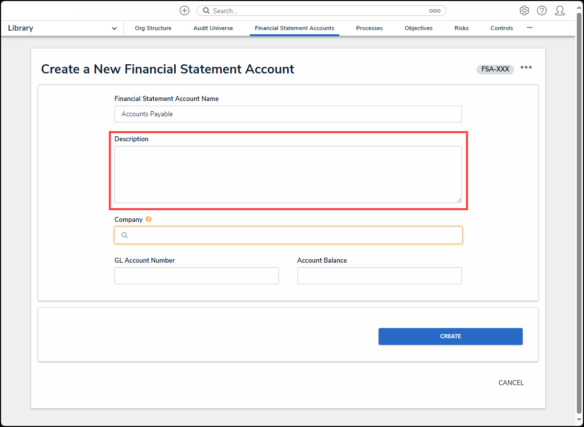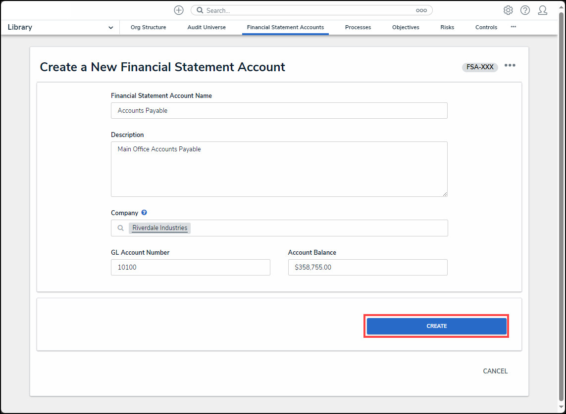 Users can create a Financial Statement Account record within the system through the Library section, in order to manually add new financial statement accounts to the system for use within the Internal Controls Management application. User can also add multiple financial statement accounts by using either the data import feature or integration feature.