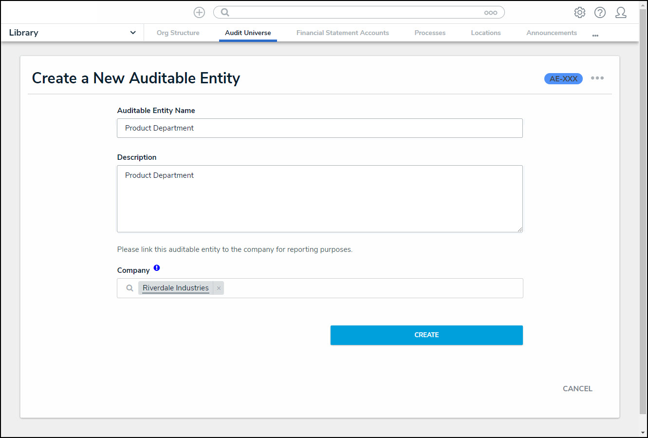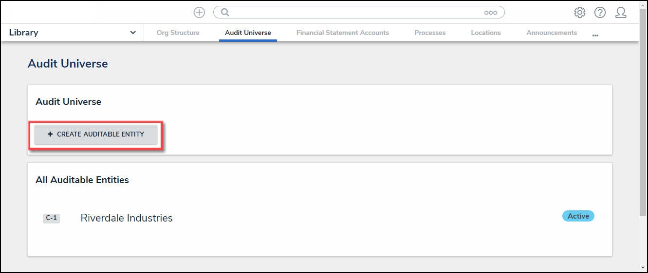 Members of the Internal Audit Team user group can create new Auditable Entities using the Library application. Auditable Entities are auditable areas of an organization (e.g., a business unit, branch, or project).