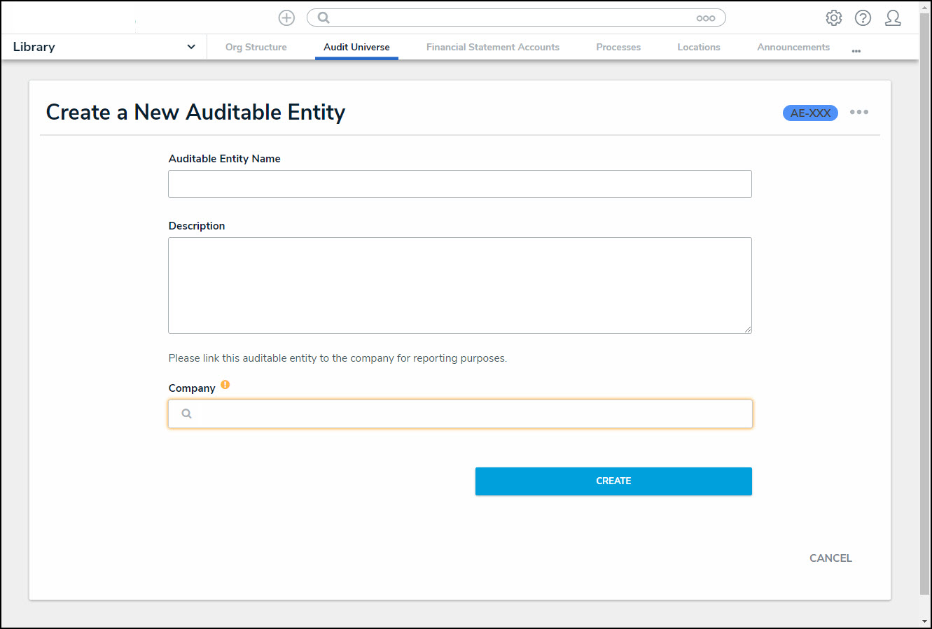 - Enter a company name in the Company field and select a Company from the Company dropdown menu. Selecting a company will link the Auditable Entity to that company for reporting purposes.