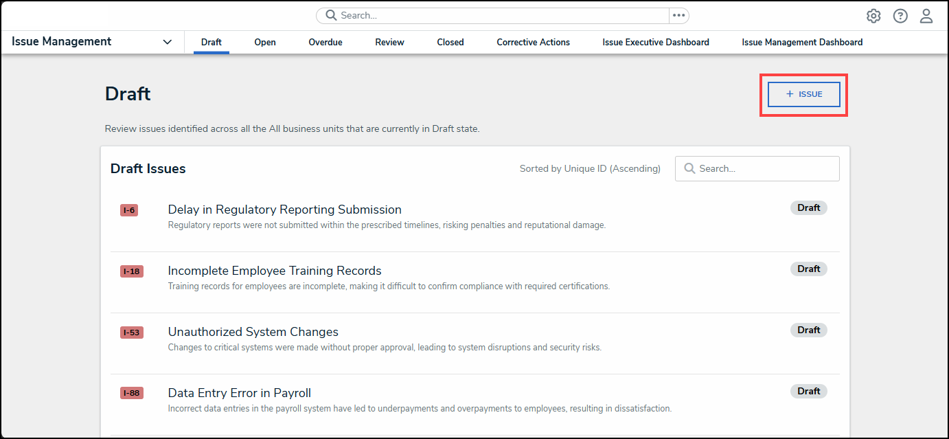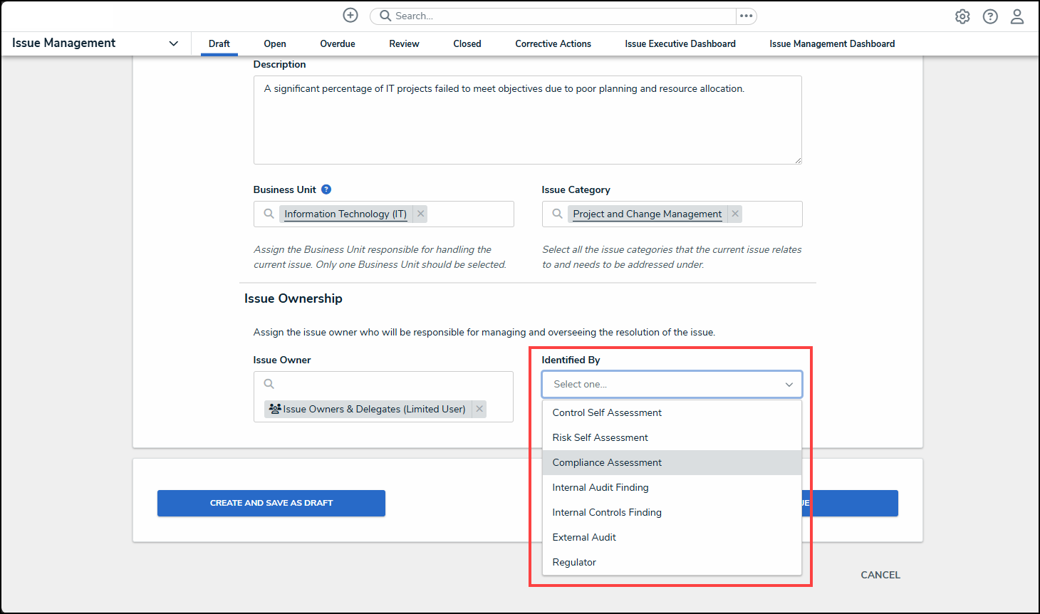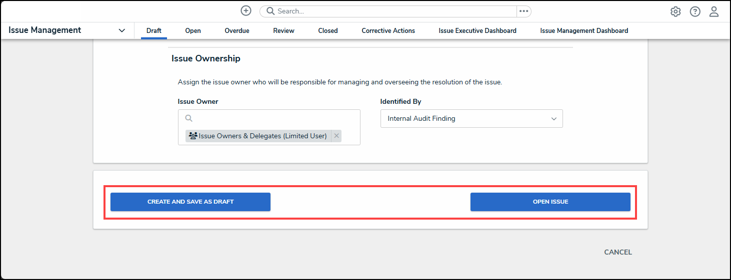 - Create and Save as Draft: This button allows you to save the issue as a draft if you intend on adding additional information or do not have all the required information when creating the issue.