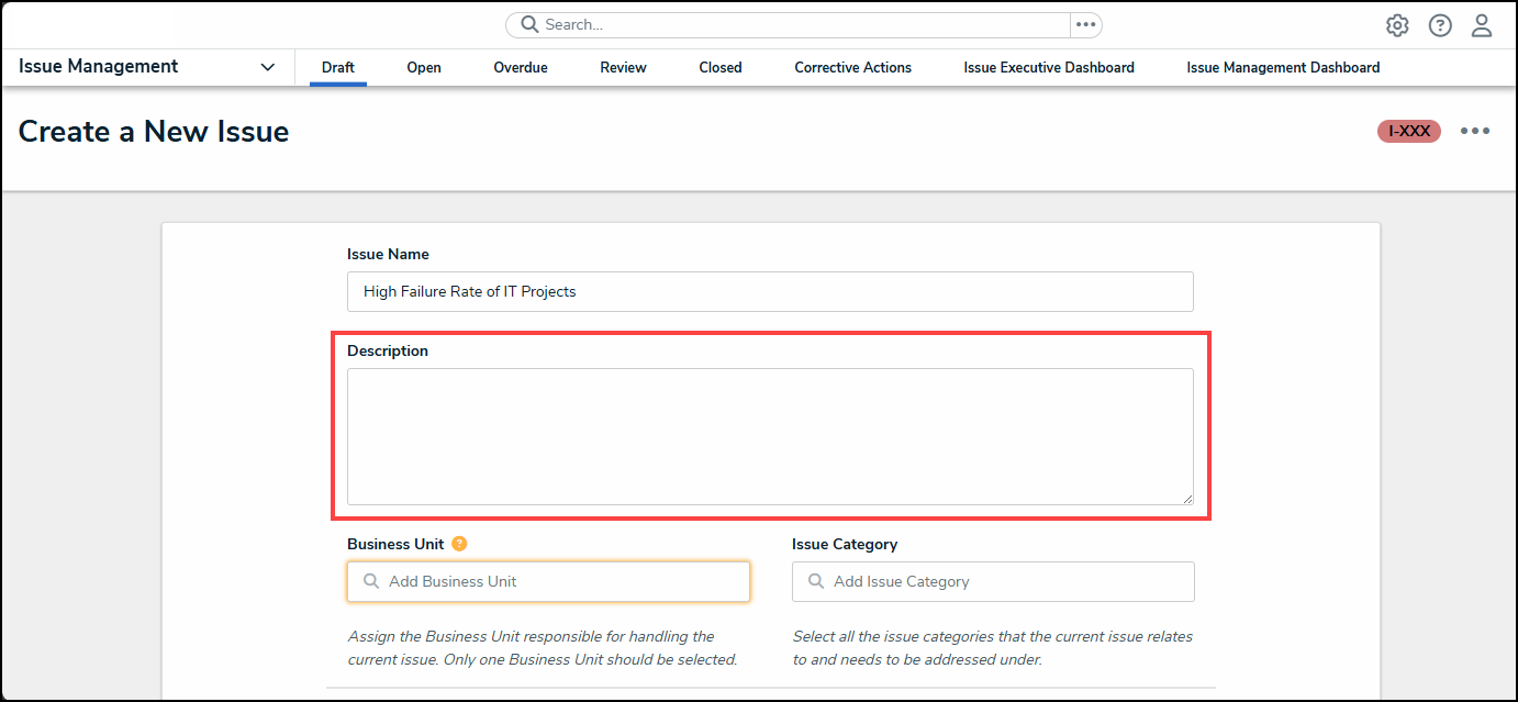 - From the Create a New Issue screen, enter an issue name in the Issue Name field. The Issue Name field is a brief description outlining the issue that can be used to identify the issue throughout the application.