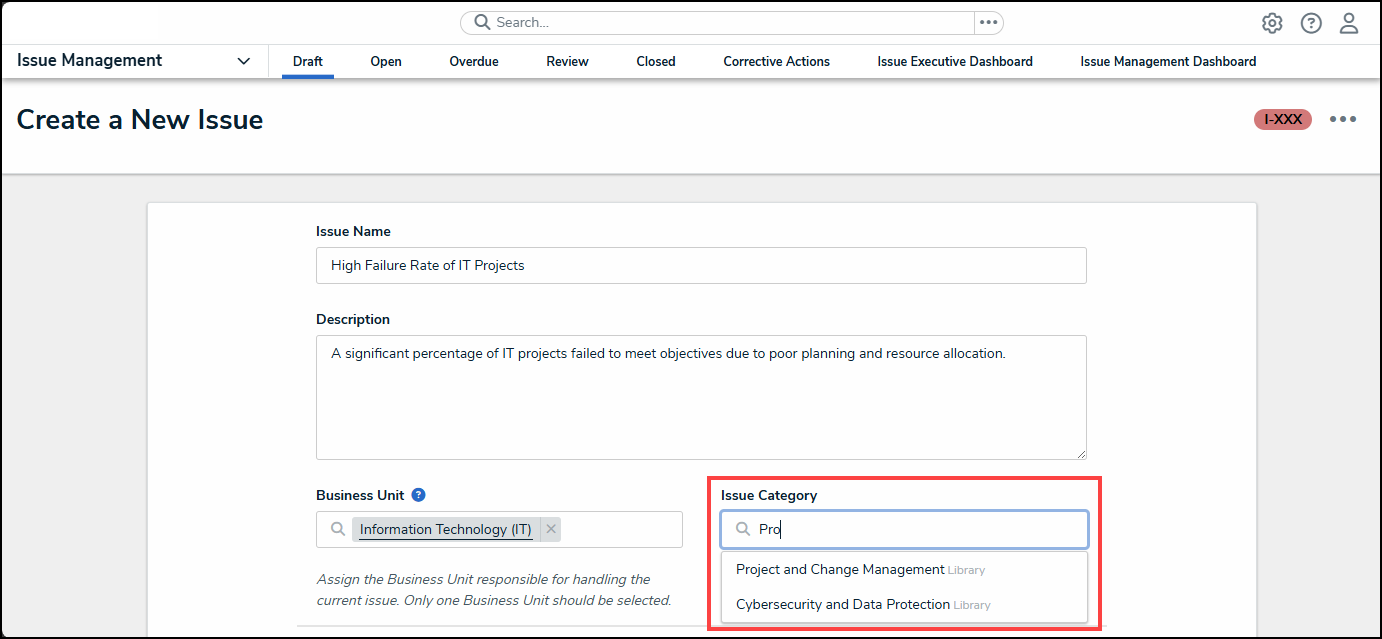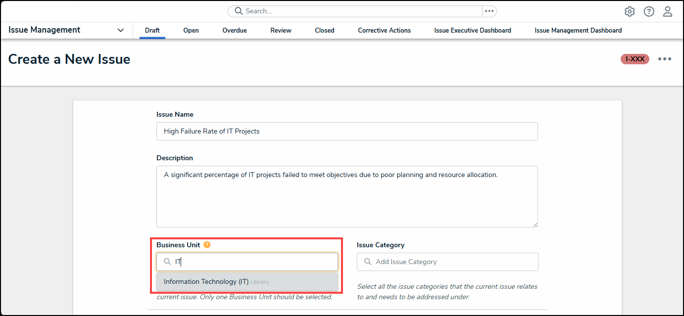 - Click the Issue Category field and enter an issue category name. Select an issue category from the Issue Category dropdown menu. The Issue Category field is used for reporting and categorization purposes.