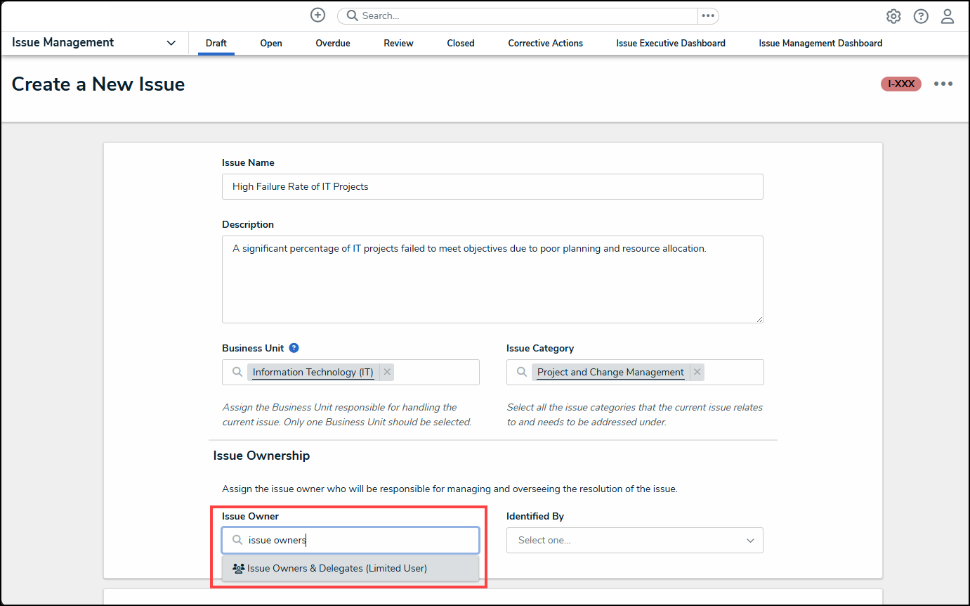- From the Issue Owner section, enter a username or user group name in the Issue Owner field and select an issue owner from the dropdown menu. The Issue Owner is responsible for documenting the details of the issue.