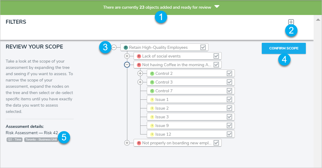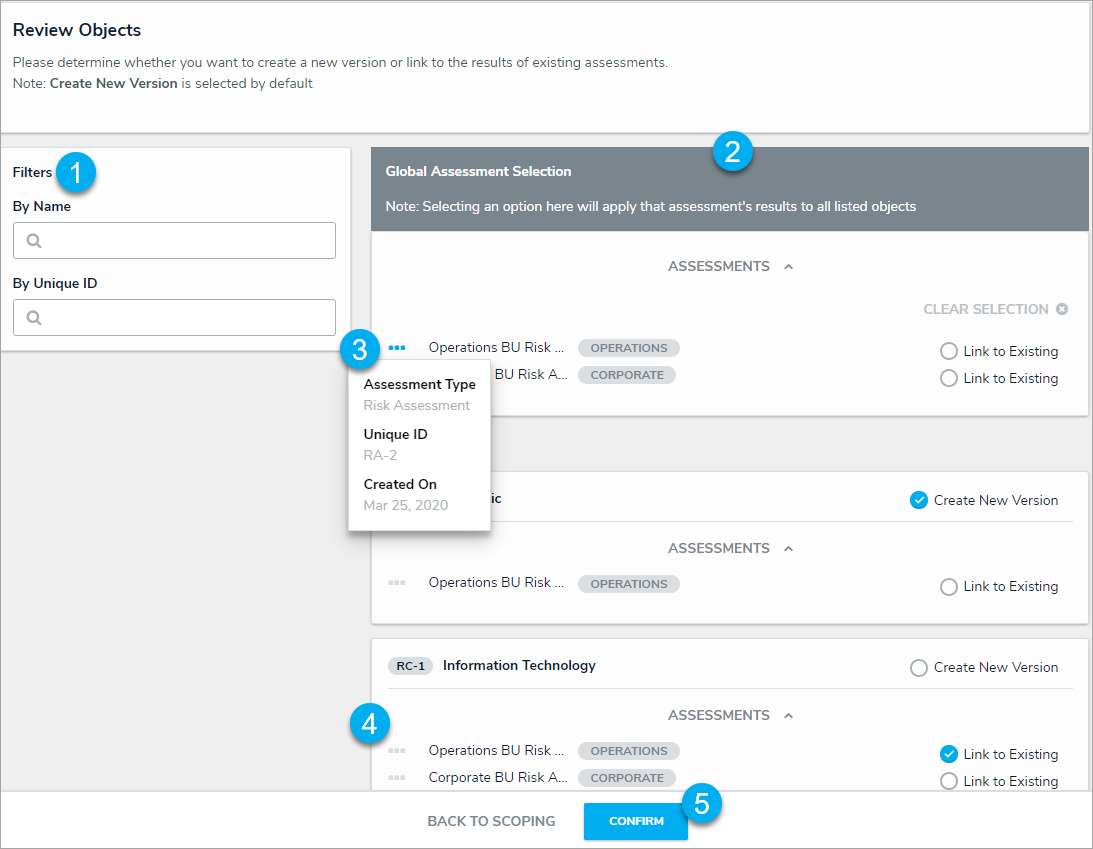 - Saves the selection of objects and instances added to the scope and launches the assessment. If an admin has enabled the option to reuse data from other assessments and users have permission to access those objects, clicking Confirm Scope > Review Objects will display an additional page to review and select that data before the assessment is launched.